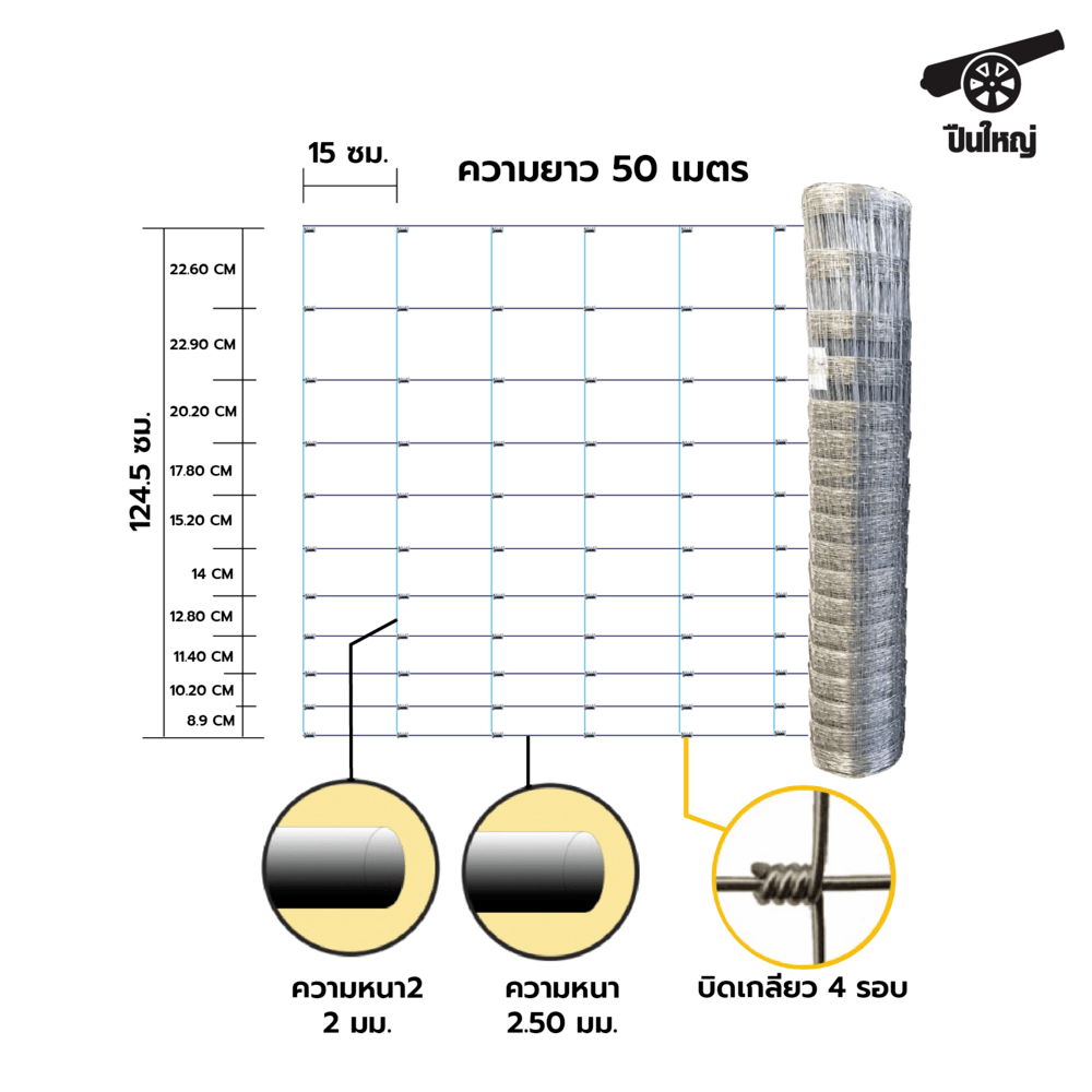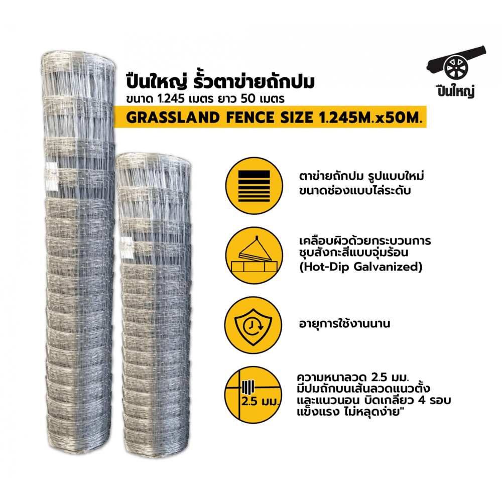 ปืนใหญ่ รั้วตาข่ายถักปม (GRASSLAND FENCE)เหมาะสำหรับใช้ล้อมพื้นที่ ,ที่ดินเปล่าเพื่อป้องกันการบุกรุก,ทำรั้วสวน โดยมีให้เลือกใช้งาน 2รูปแบบ คือ แบบขนาดช่องห่างเท่ากัน และ แบบไล่ระดับ ขนาดช่องถี่ล่างห่างบน มีความสูงให้เลือก 3 ระดับเริ่มตั้งแค่ 90ซม. , 120ซม. และ 150ซม. ความยาวได้ถึง 30-50เมตร