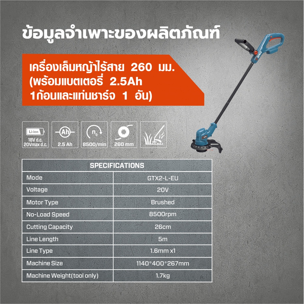 ระบบกระปุ๊กป้อนสายตัดไนล่อน : ป้อนสายโดยอัตโนมัติเมื่อจำเป็นหรือแตะลงพื้นเพื่อปล่อยสายเพิ่ม