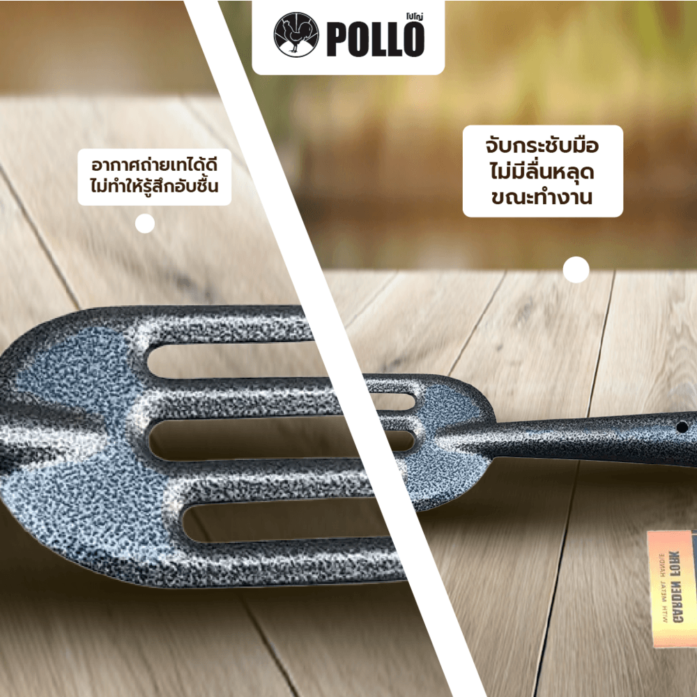 การออกแบบที่เหมาะสม : POLLO ออกแบบส้อมพรวนให้มีรูปแบบที่ใช้งานง่ายและสะดวกต่อการจับ ซึ่งช่วยลดความเมื่อยล้าขณะใช้งาน