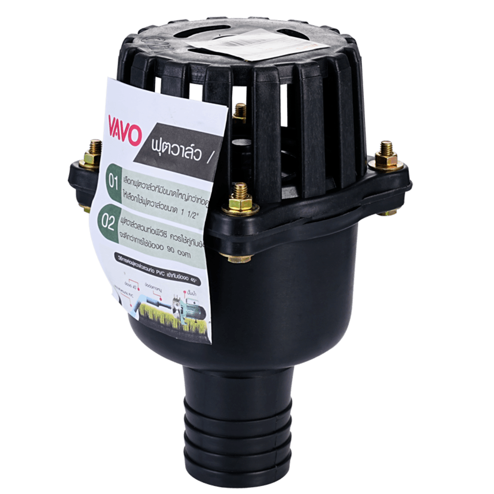 VAVO ฟุตวาล์ว PVC สวมเร็ว สีดำ 2 นิ้ว เป็นวาล์วที่ออกแบบมาเพื่อป้องกันน้ำไหลย้อนกลับเมื่อหยุดการทำงานของปั๊มน้ำ ผลิตจาก PVC คุณภาพสูง แข็งแรง ทนทานต่อการกัดกร่อน ติดตั้งง่าย เพียงแค่สวมลงบนท่อ PVC เหมาะสำหรับงานระบบน้ำประปาขนาดเล็กถึงกลาง เช่น ระบบน้ำในบ้าน อาคารพาณิชย์ หรือการเกษตร