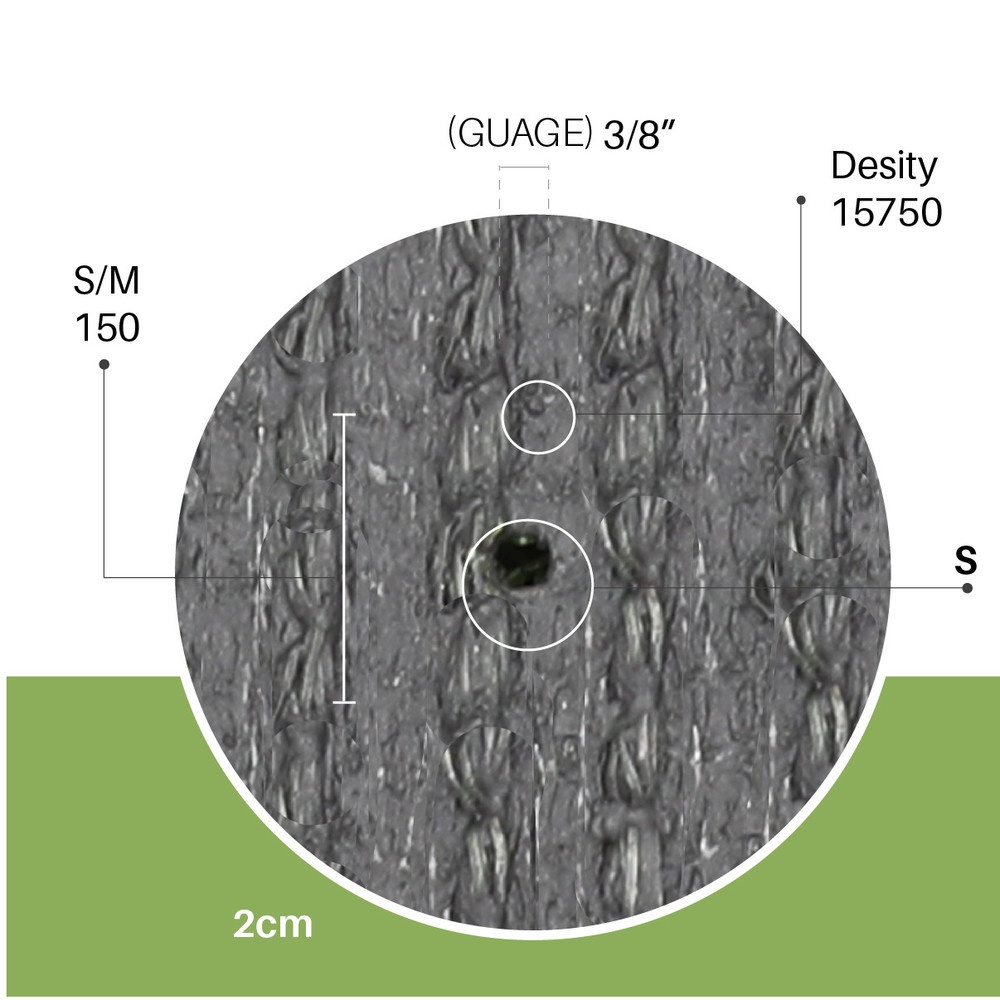 | ความสูงของเส้นใย (มม.) ±1มม.: 20 ระยะห่างเข็ม (นิ้ว): 3/8 อัตราการเย็บ (ต่อ 10 ซม.) ±3%: 15 ความหนาแน่นของการเย็บ (ต่อตารางเมตร) ±3%: 15,750 ค่าเดเท็กซ์ (±10%): 9,200 วัสดุเส้นใย: PE+PP สี: 4-โทน วัสดุรองด้านหลัง: ผ้า PP+ตาข่าย การเคลือบ: สีดำ SBR น้ำหนัก กก./ตร.ม. (±10%): 1.93 |