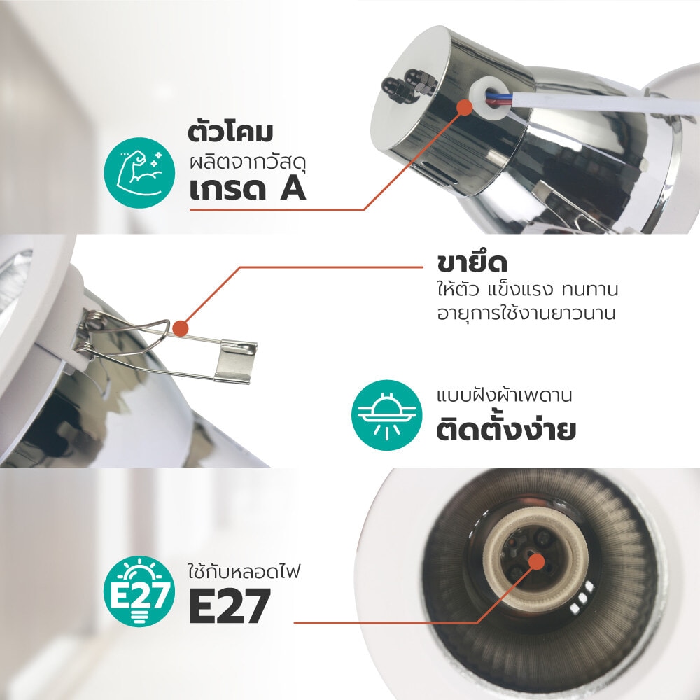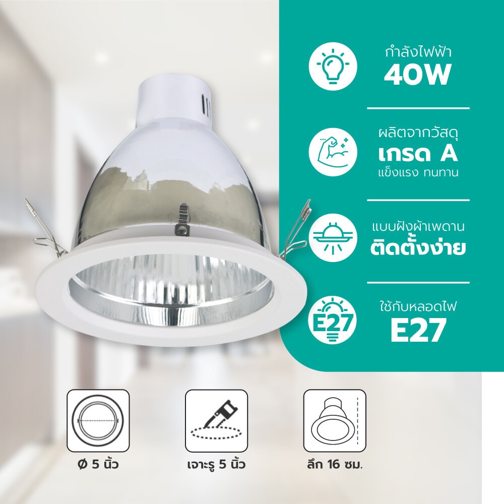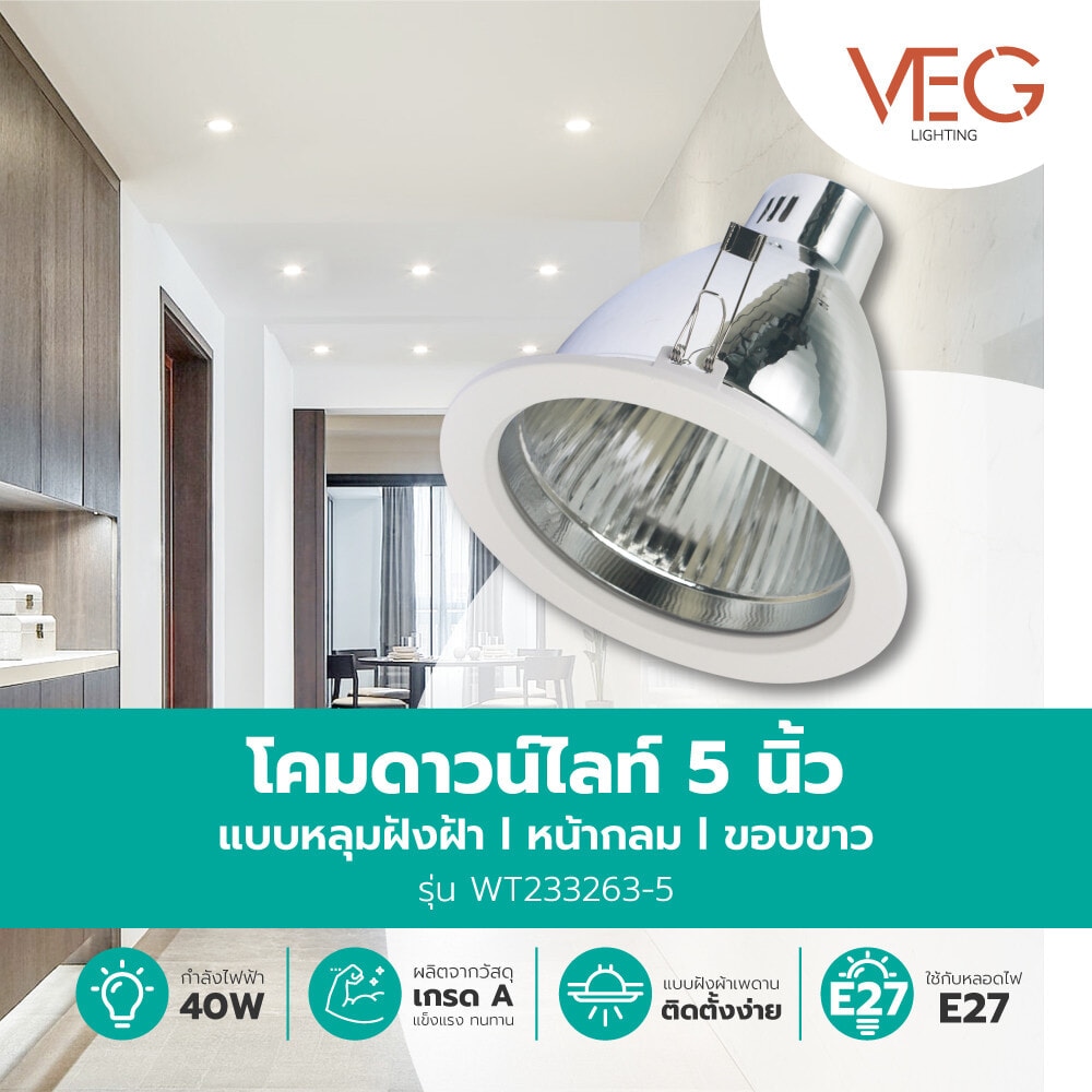 โคมดาวน์ไลท์แบบหลุมฝังฝ้าหน้ากลม V.E.G. รุ่น WT233263-5 ขอบขาว 5 นิ้ว E27 มีรายละเอียดสินค้าดังนี้: