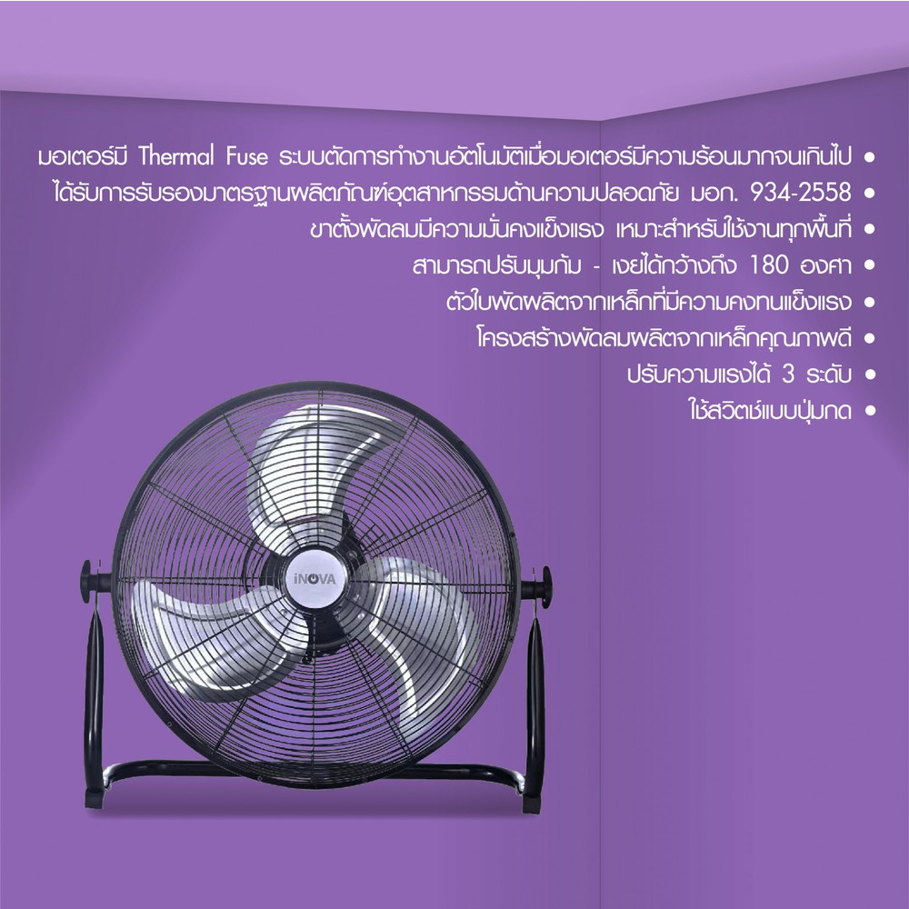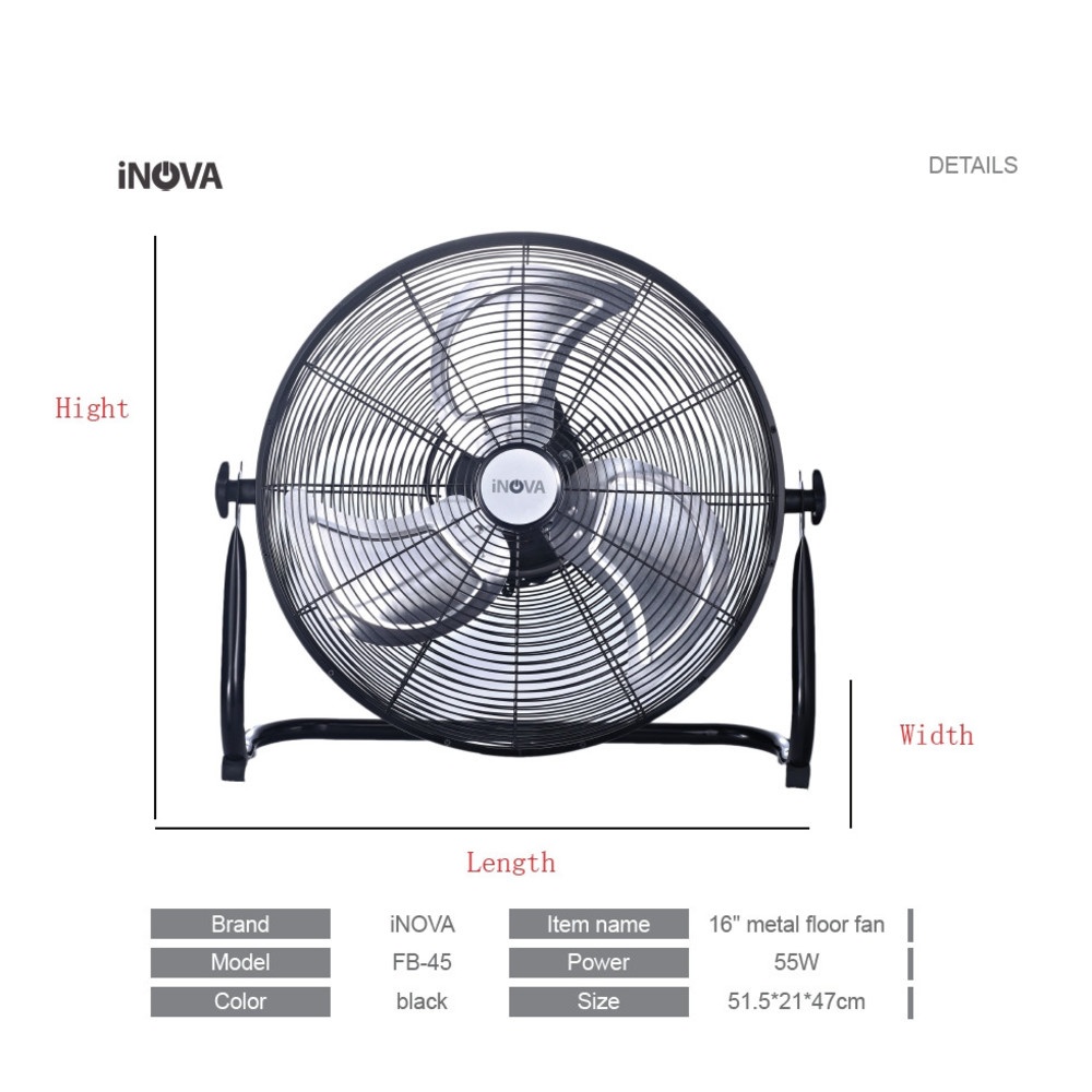 INOVA พัดลมอุตสาหกรรมตั้งพื้น ขนาด 16 นิ้ว รุ่น FB-45 สีดำ พัดลมอุตสาหกรรมรุ่นตั้งพื้น สามารถเคลื่อนย้ายได้สะดวก ให้ลมแรง โครงสร้างพัดลมผลิตจากเหล็กคุณภาพดี ขาตั้งพัดลมมีความมั่นคงแข็งแรง เหมาะสำหรับใช้งานทุกพื้นที่