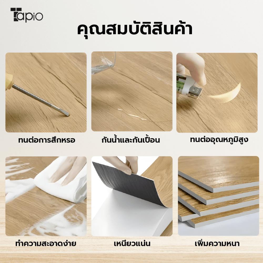 - ลวดลายและสีสันหลากหลาย: Tapio มีดีไซน์ที่ทันสมัย มีลวดลายและสีสันให้เลือกหลากหลาย โดยเฉพาะลายไม้ที่ให้ความรู้สึกเหมือนไม้ธรรมชาติ แต่ดูแลรักษาง่ายกว่า