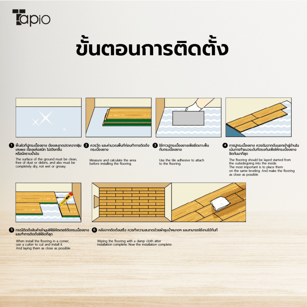 4. ติดตั้งง่าย การติดตั้งแบบ Dryback: กระเบื้องยาง Tapio ส่วนใหญ่ใช้ระบบติดตั้งแบบ Dryback ซึ่งหมายถึงการติดตั้งด้วยการใช้กาวยึดติด ทำให้ติดตั้งได้ง่ายและสะดวก