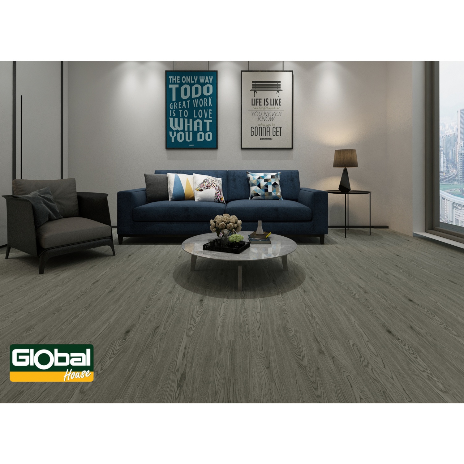6. เมื่อทำการติดตั้งจนเต็มพื้นที่เรียบร้อยแล้ว ทำการปิดขอบกระเบื้องด้วยตัวจบกระเบื้องยาง โดยสามารถใช้บัว PVC หรือกรุยเชิงอลูมิเนียม เพื่อจบงานจากทางโกลบอลเฮาส์ก็ได้