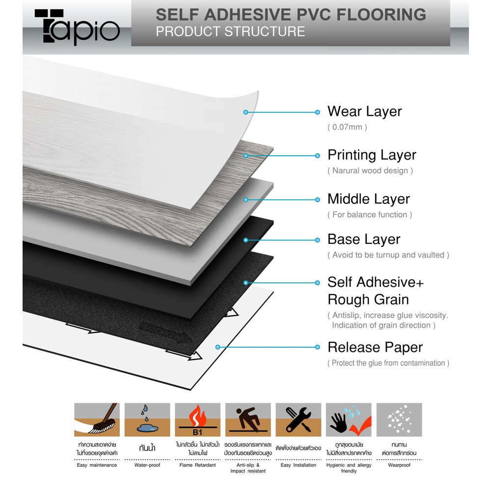 1. ตัวกระเบื้องมาพร้อมกับกาวด้านหลัง สะดวกในการติดตั้ง