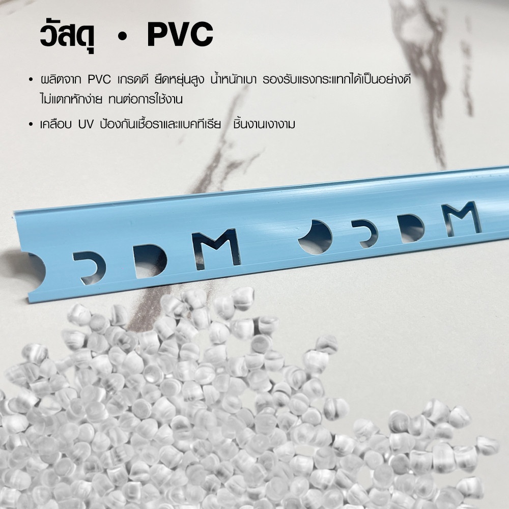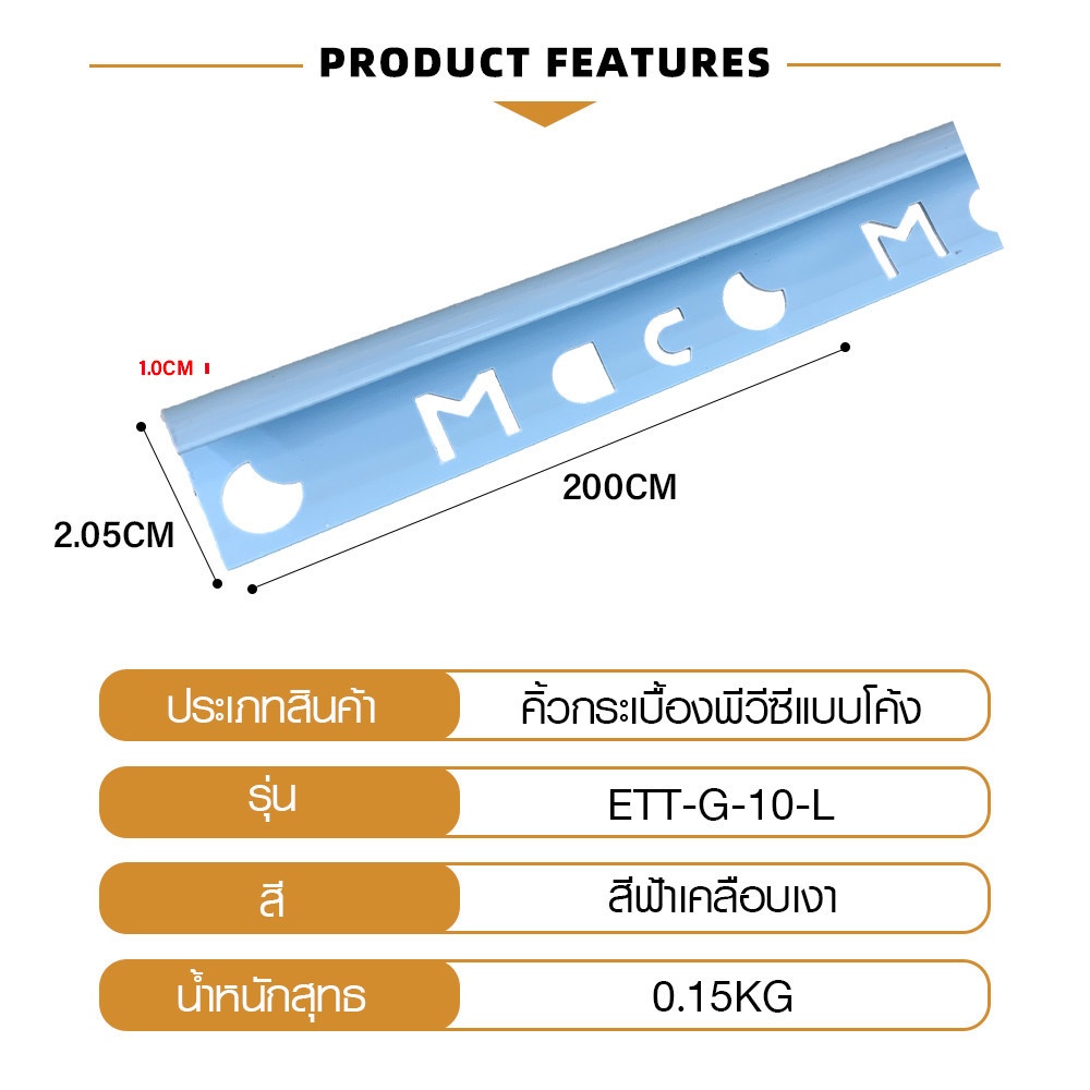คิ้วกระเบื้องPVC จากแบรนด์ MAC เป็นวัสดุที่ใช้สำหรับการตกแต่งขอบของกระเบื้องปูพื้นและกระเบื้องปูผนัง ซึ่งมีคุณสมบัติที่มีเนื้อแน่น ผิวเรียบตลอดทั้งเส้น ไม่แตกหักง่าย ทนทาน และใช้งานได้อย่างยาวนาน ป้องกันการแตกร้าวของกระเบื้องได้ในระยะยาว