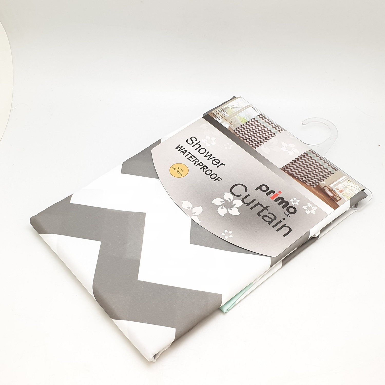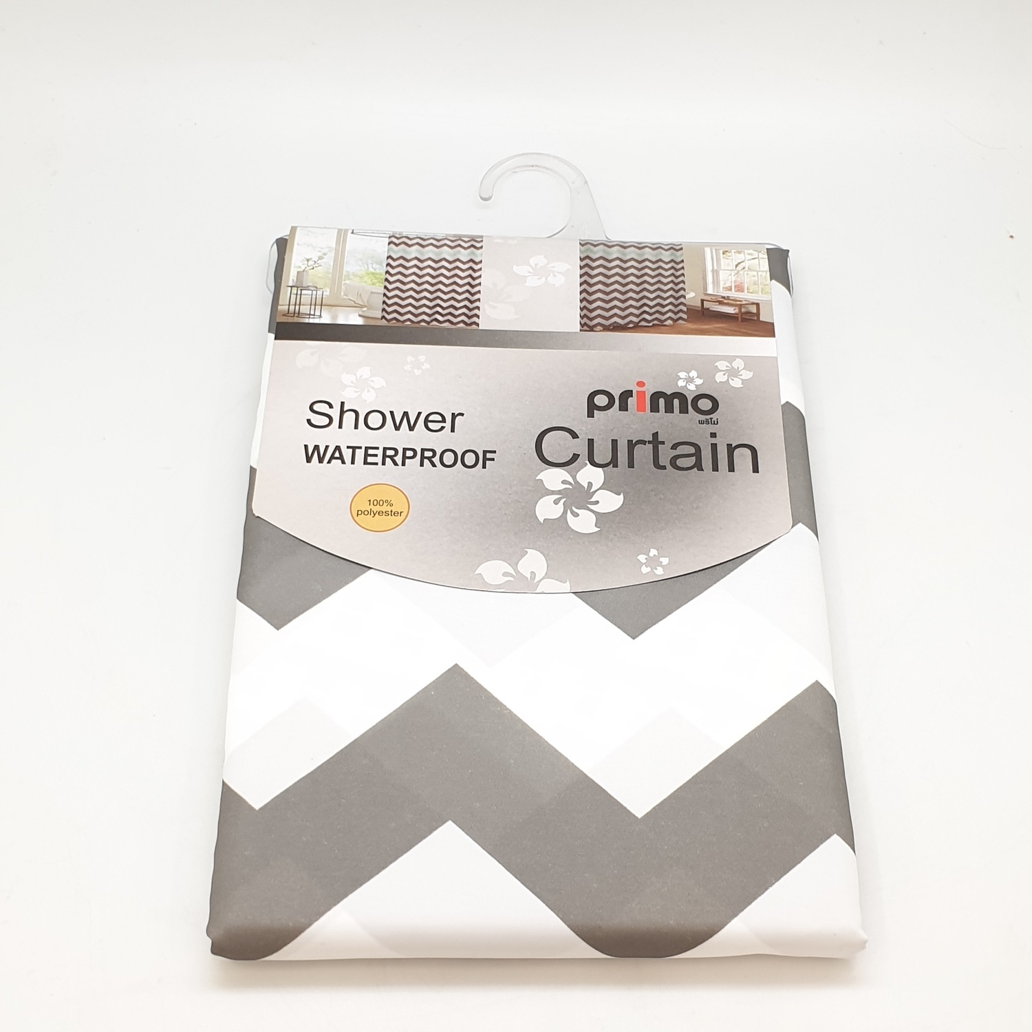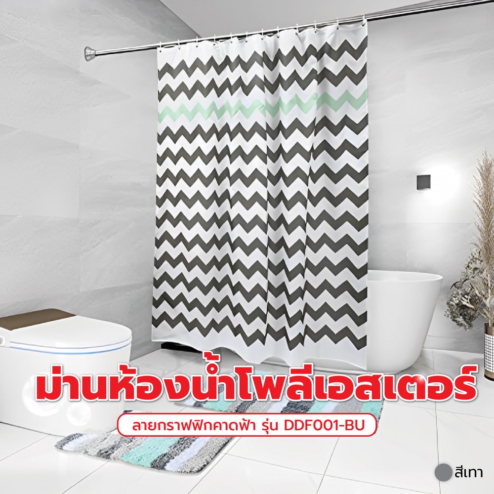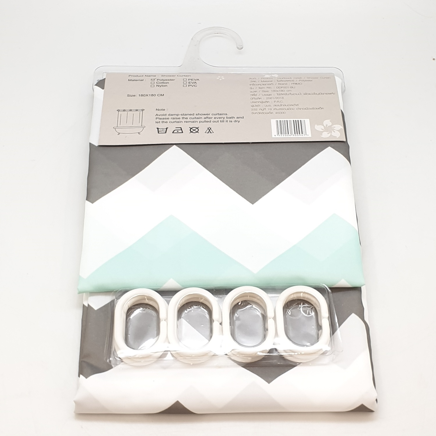 Primo ม่านห้องน้ำโพลีเอสเตอร์ ลายกราฟฟิกคาดฟ้า รุ่น DDF001-BU ขนาด 180x180 ซม. สีเทา