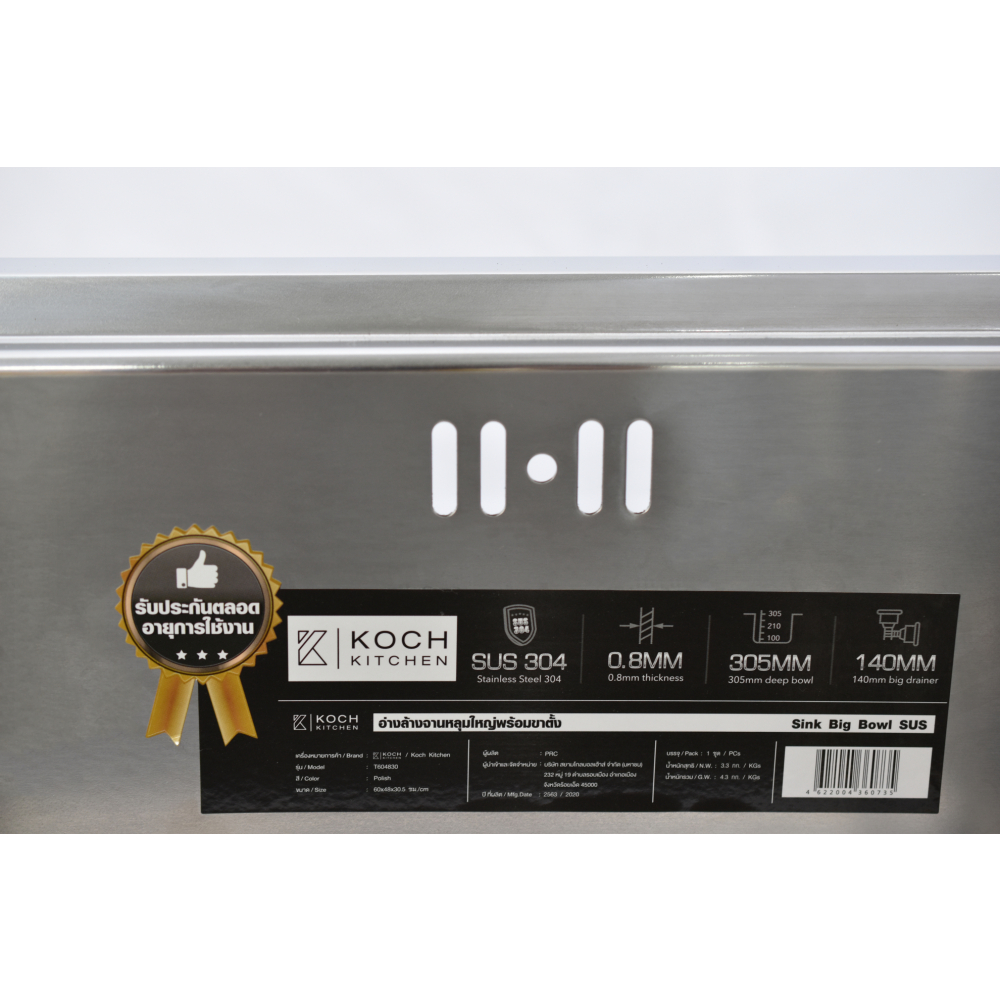 KOCH KITCHEN อ่างล้างจานพร้อมขาตั้ง 1 หลุมไม่มีที่พัก SUS304 BIG BOWL 60x48x79 ซม.