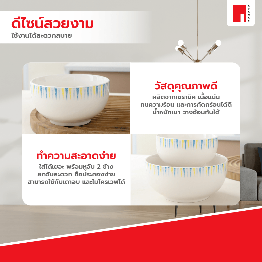 เพิ่มอรรถรสในการรับประทานอาหารด้วยถ้วยเซรามิคจาก ADAMAS ผลิตจากเซรามิคคุณภาพดี เนื้อหนา เนียนละเอียด มีความทนทาน มาพร้อมกับดีไซน์รูปทรงกลม สวย มีลวดลายเป็นเอกลักษณ์ ช่วยเพิ่มความโดดเด่นให้กับอาหารจานโปรดของคุณได้อย่างลงตัว ไม่ว่าจะเป็นอาหารมื้อหนัก หรือของว่างกินเล่นเบาๆ ก็สะดุดตาทุกครั้งที่จัดโต๊ะ