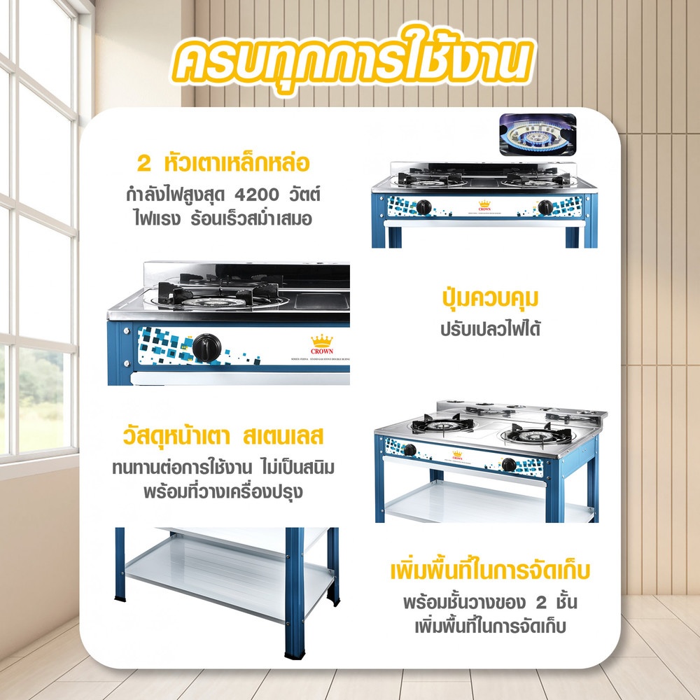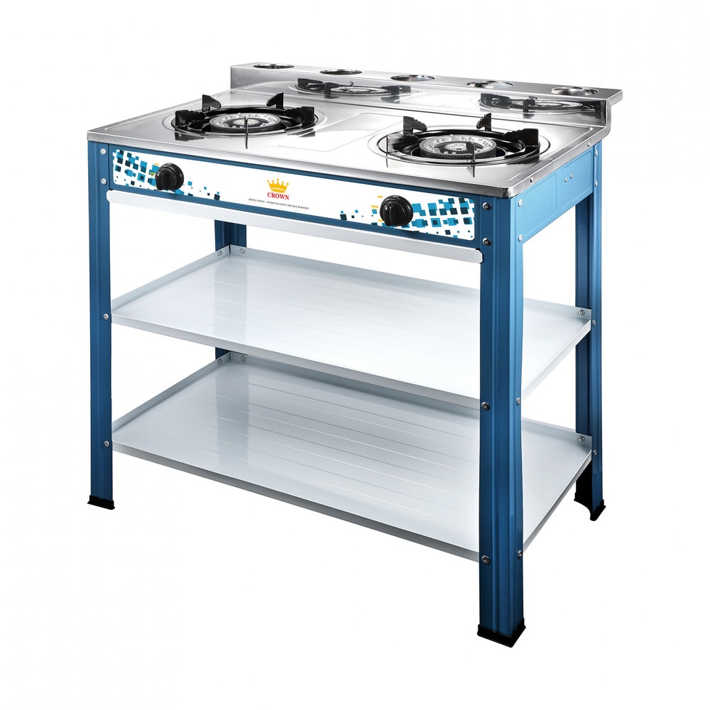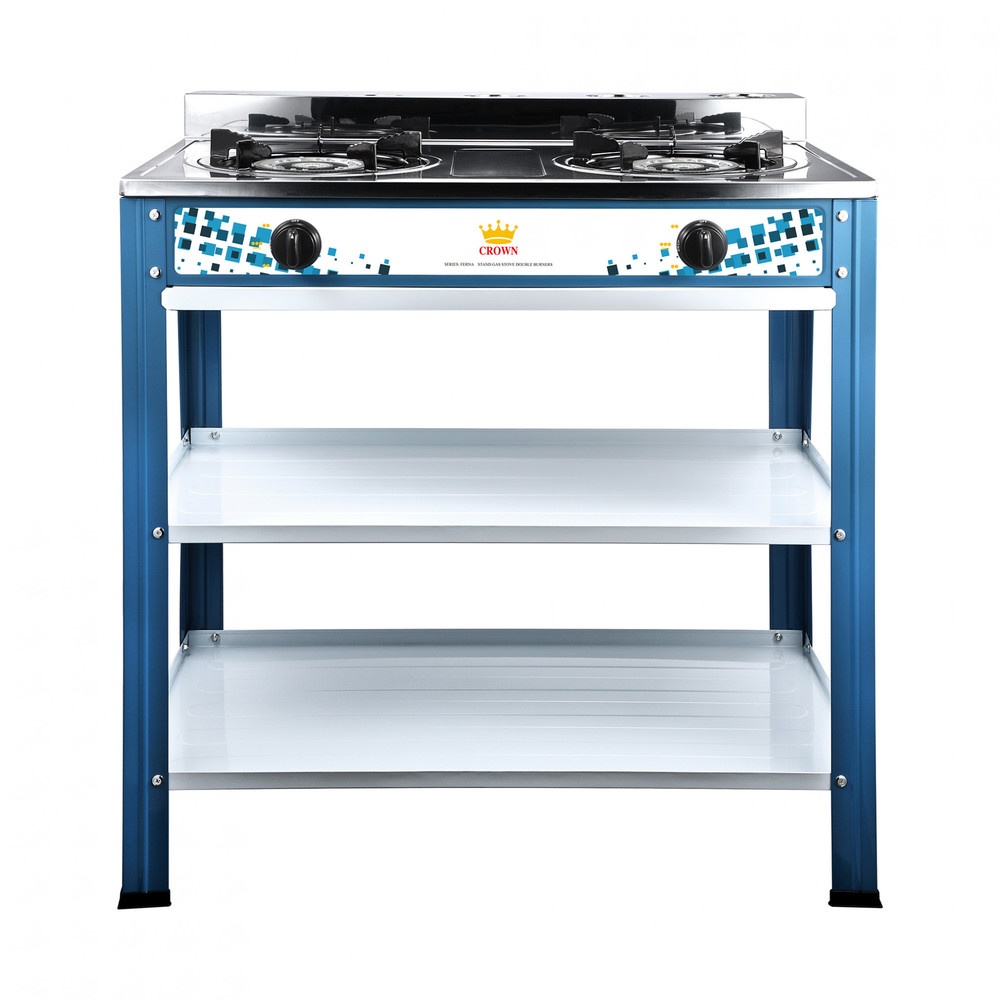 CROWN เตาแก๊สพร้อมขาหน้าสเตนเลส 2 หัวเตา FERNA สีน้ำเงิน