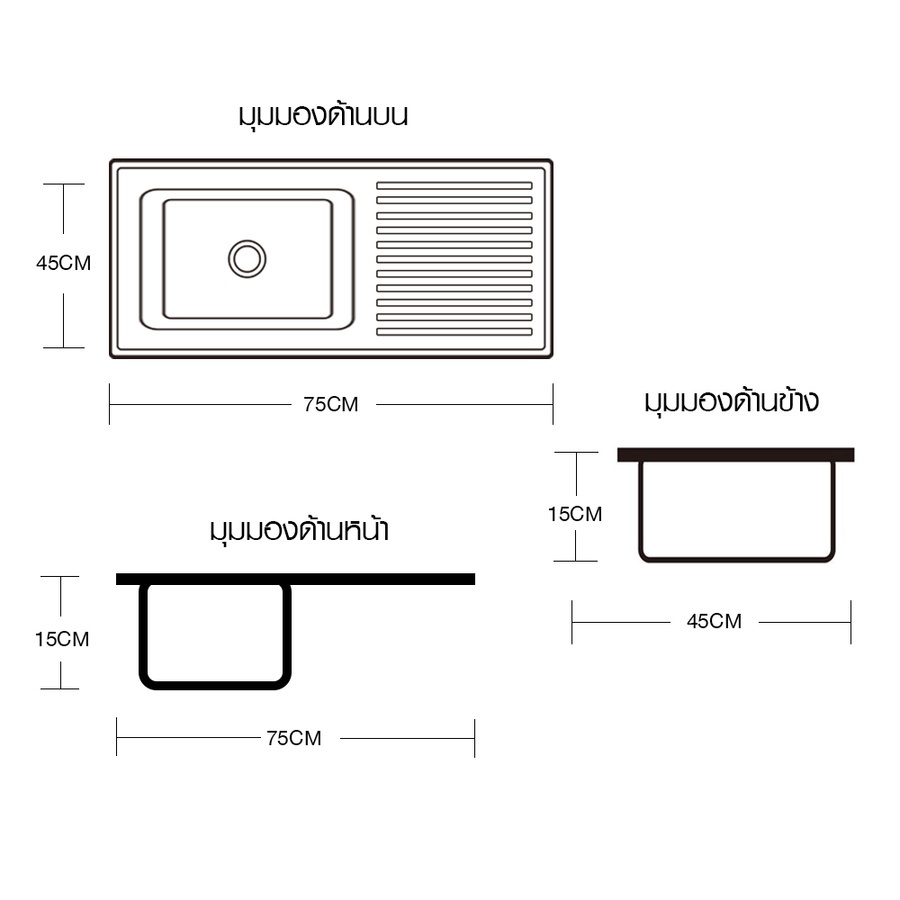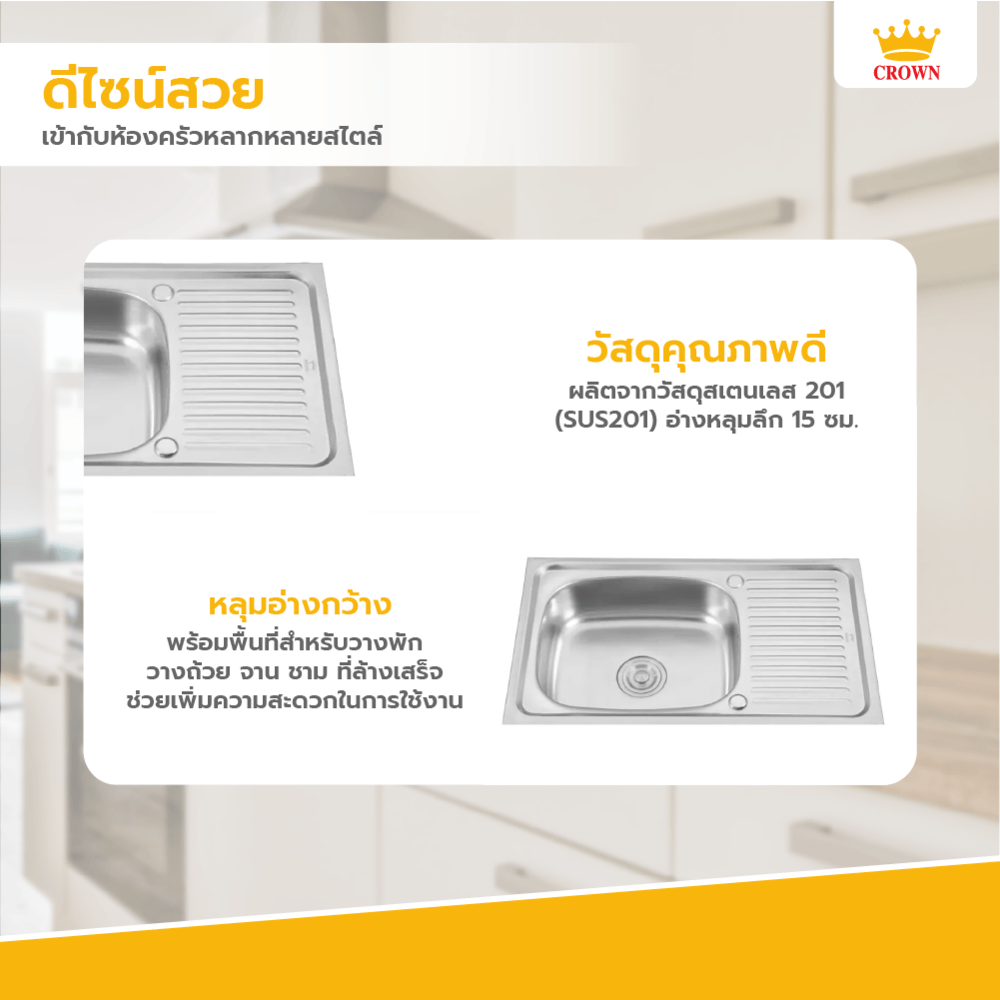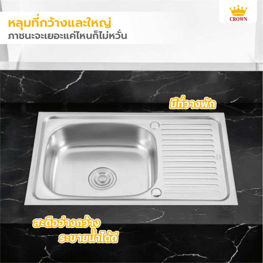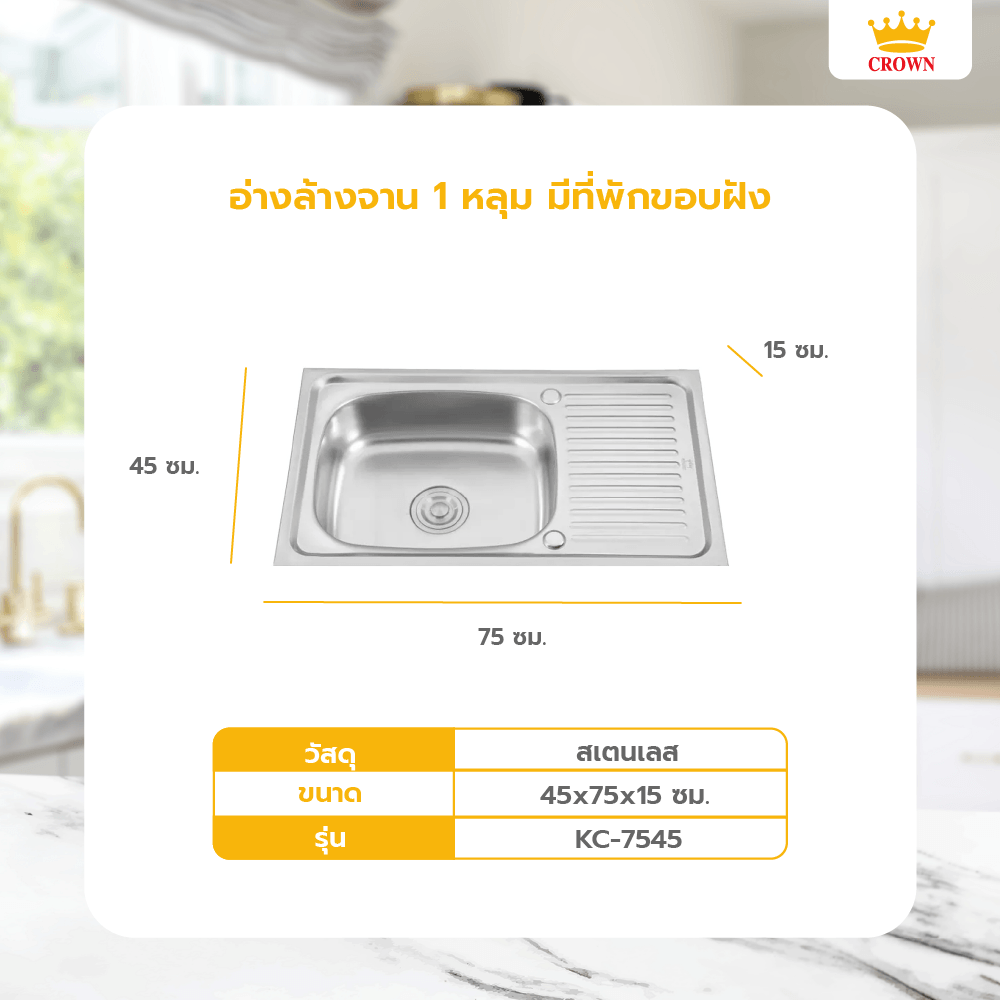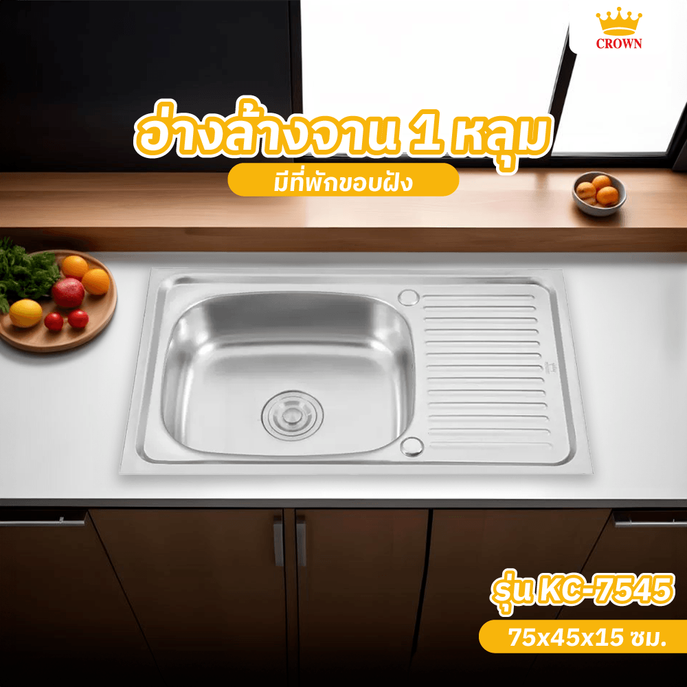 CROWN อ่างล้างจาน 1หลุม มีที่พักขอบยก 75x45x15 ซม. KC-7545