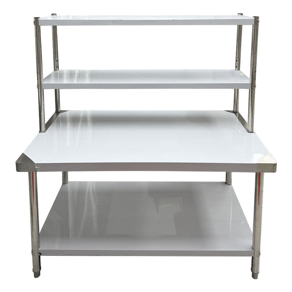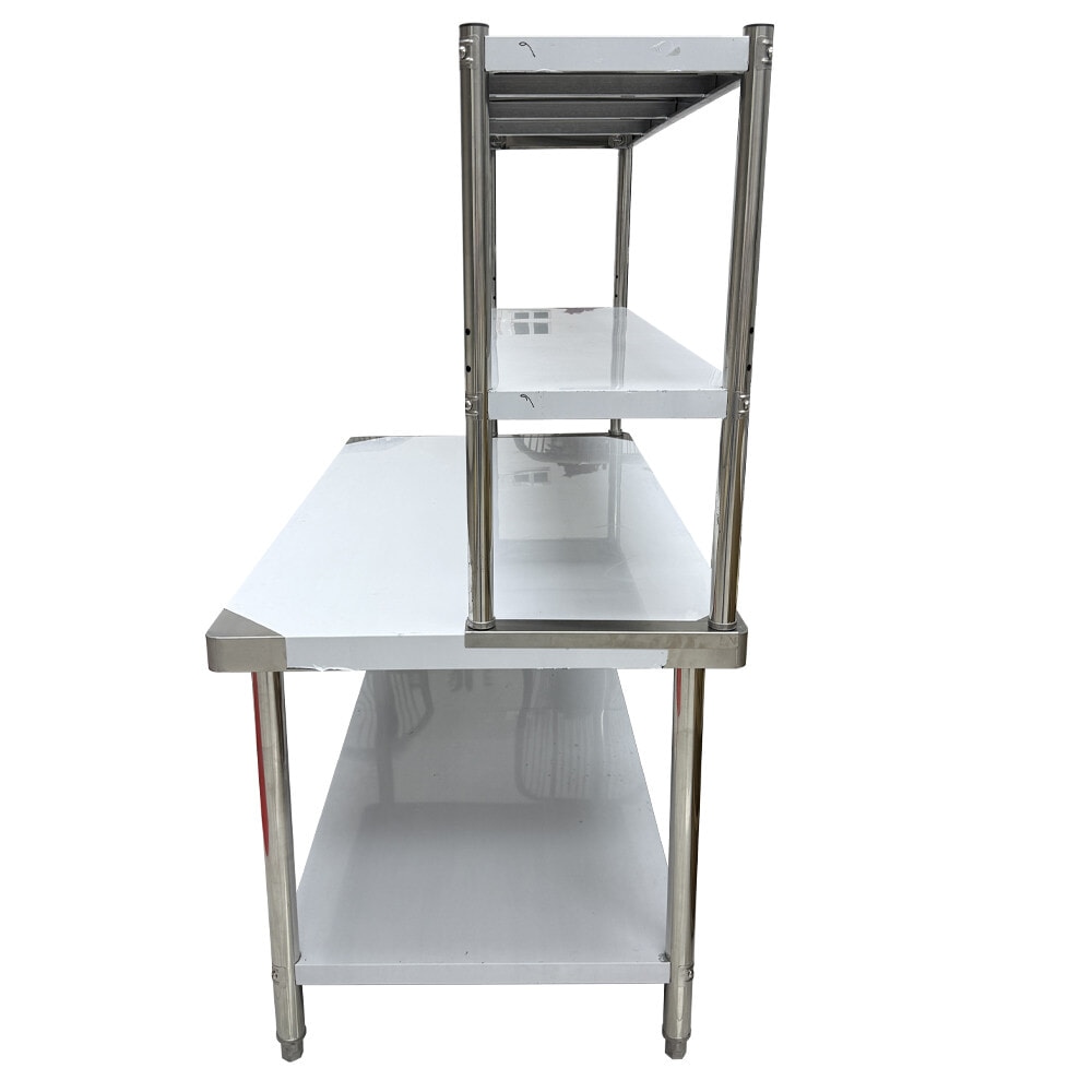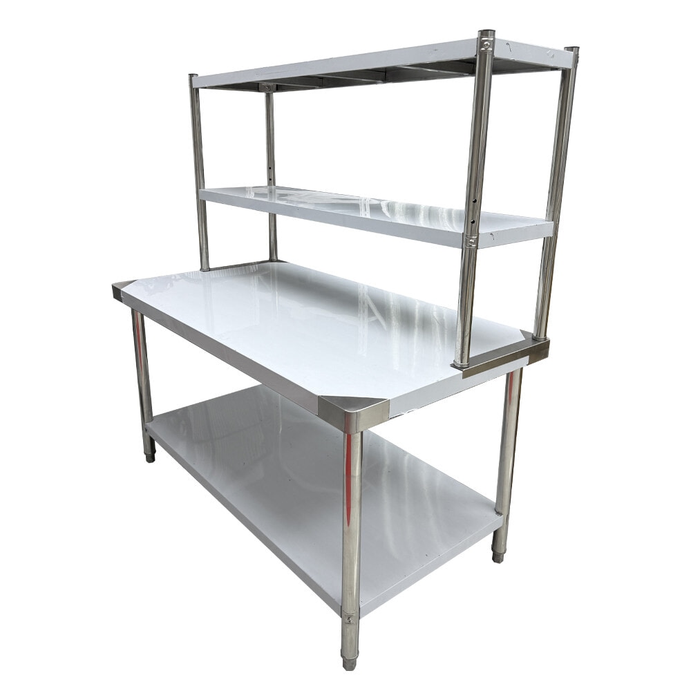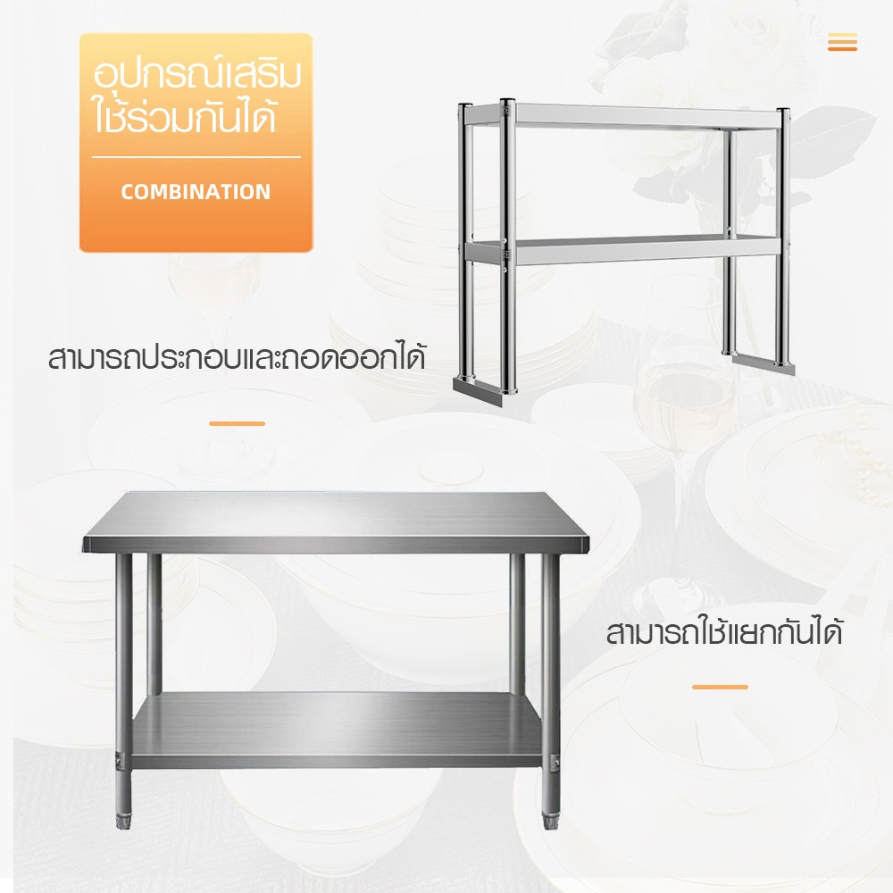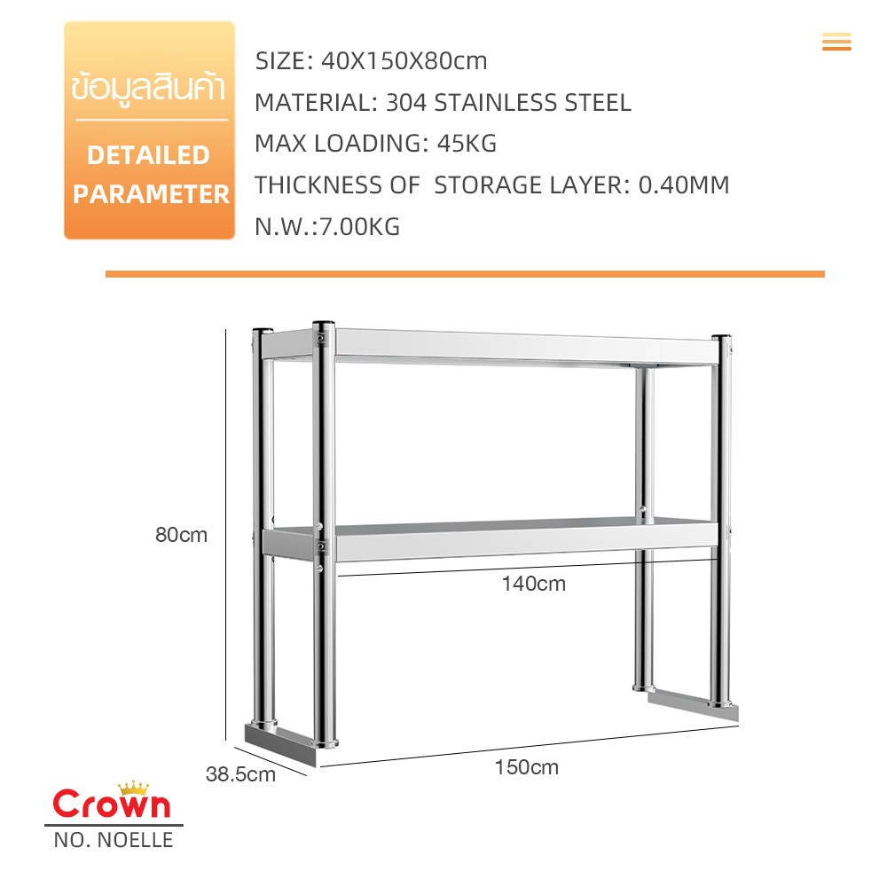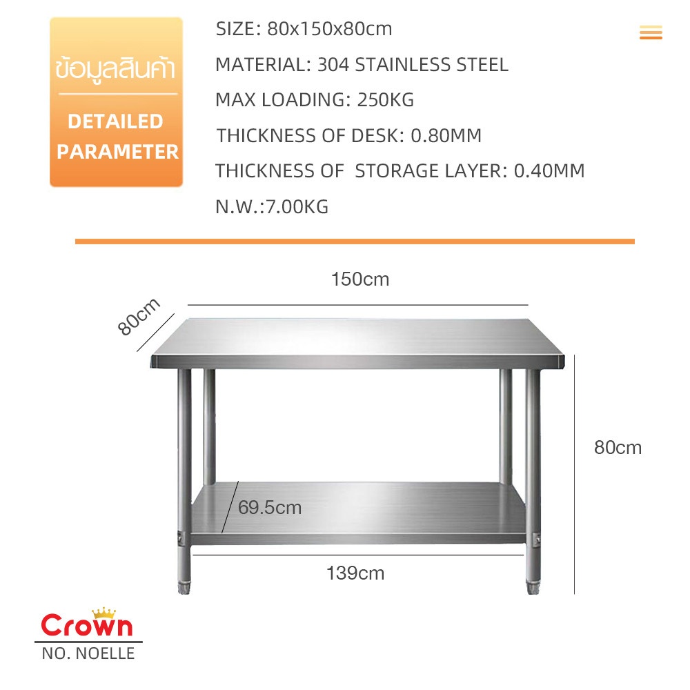 CROWN โต๊ะเตรียมสเตนเลส 2 ชั้น รุ่น NOELLE-SS304 ขนาด 150x80x160 ซม. เป็นอุปกรณ์ครัวสแตนเลสเกรด 304 ที่ออกแบบมาเพื่อรองรับการใช้งานหนักในครัวอุตสาหกรรม ร้านอาหาร หรือโรงแรม ผลิตจากสแตนเลสเกรด 304 มีความทนทานต่อการกัดกร่อนและไม่เป็นสนิม เหมาะสำหรับการใช้งานในสภาพแวดล้อมที่มีความชื้นสูง เช่น ห้องครัว