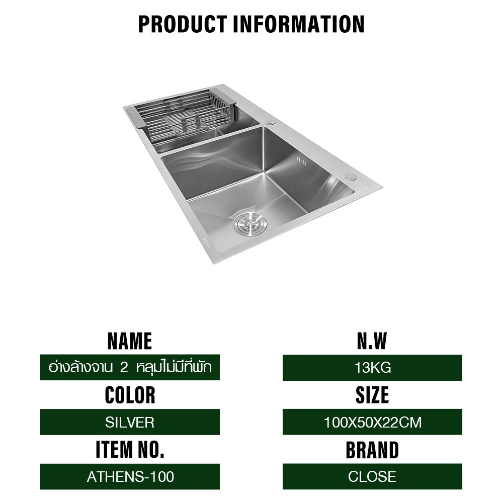 CLOSE อ่างล้างจาน 2 หลุมไม่มีที่พัก SS304 100x50x22 ซม. ATHENS-100