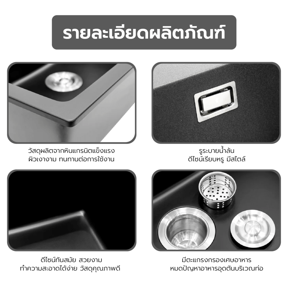 อ่างล้างจานผลิตจากหินแกรนิตคุณภาพดี ทนทานต่อการใช้งานเป็นอย่างดี มาพร้อมกับดีไซน์ทันสมัย สวยงาม ให้ครัวของคุณสวยโดดเด่นสะดุดตา