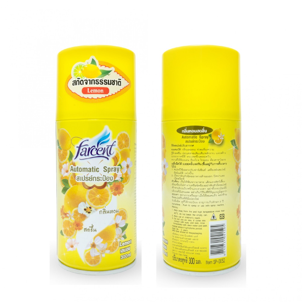 รีฟิลสเปรย์ปรับอากาศ FARCENT ผลิตภัณฑ์สำหรับติดตั้งใช้งานร่วมกับเครื่องพ่นสเปรย์อัตโนมัติ ช่วยเติมเต็มพลังงานและความสดชื่นให้คุณรู้สึกผ่อนคลายในทุกช่วงเวลาด้วยกลิ่นหอมของเลมอนที่ผสานสารสกัดจากธรรมชาติ สร้างบรรยากาศที่ดีได้ยาวนานตลอดวันไม่ว่าจะเป็นบริเวณห้องนอน, ห้องโถง หรือห้องทำงานของคุณ
