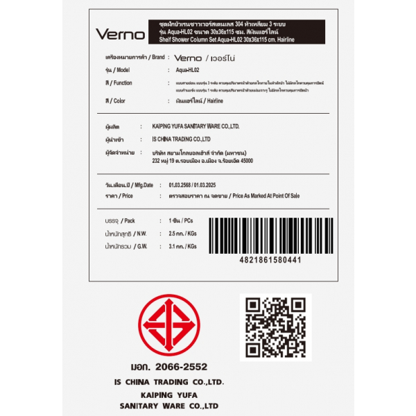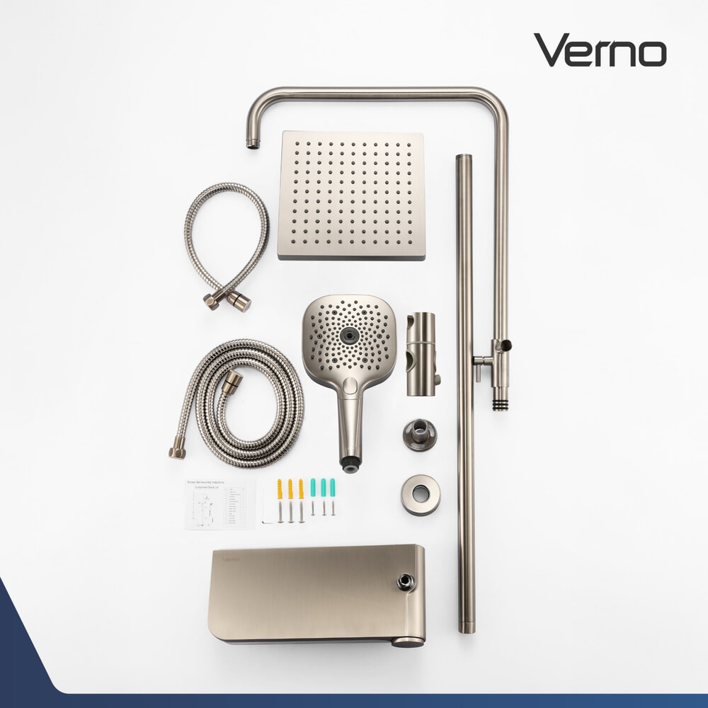 Verno ชุดฝักบัวเรนชาวเวอร์สเตนเลส 304 หัวเหลี่ยม 3 ระบบ รุ่น Aqua-HL02 ขนาด 30x36x115 ซม. สีเงินแฮร์ไลน์