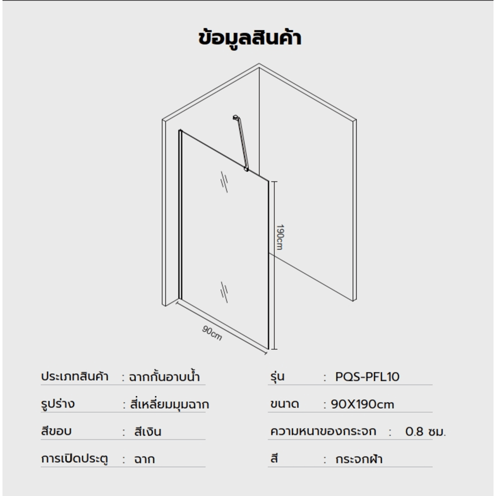 Verno ฉากกั้นอาบน้ำบานฟิกซ์ ขนาด 90x190ซม. หนา 8มม. รุ่น PQS-PFL010 กระจกฝ้า