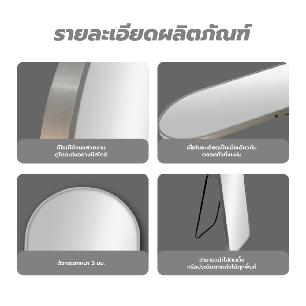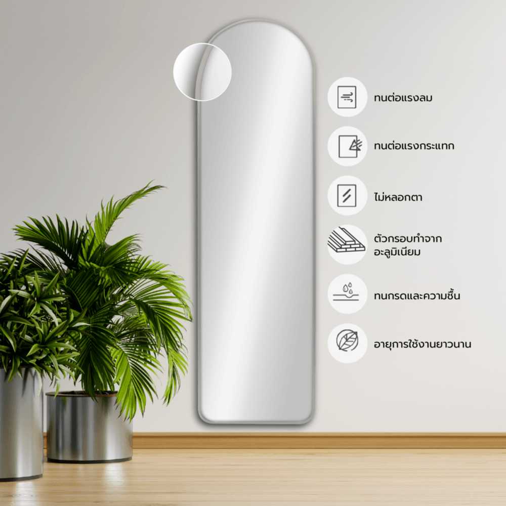 เพิ่มความโดดเด่นให้กับบ้านด้วยกระจกเงามีกรอบอะลูมิเนียมตกแต่ง Nice ชนิดตั้งพื้น ตัวกระจกมีความหนา 3 มิลลิเมตร ให้ภาพเงาสะท้อนที่คมชัด เหมือนจริง ไม่หลอกตา มาพร้อมดีไซน์รูปทรงแบบโค้งมน ให้ความแปลกใหม่และสวยงาม เข้าได้กับหลากหลายสไตล์การแต่งห้อง สามารถนำไปติดตั้งหรือประดับตกแต่งผนังบ้านได้ทุกพื้นที่ เพื่อให้คุณใช้ส่องบุคลิกภาพ ทั้งเสื้อผ้า หน้า ผม ช่วยสร้างความมั่นใจก่อนออกจากบ้านในทุก ๆ วัน