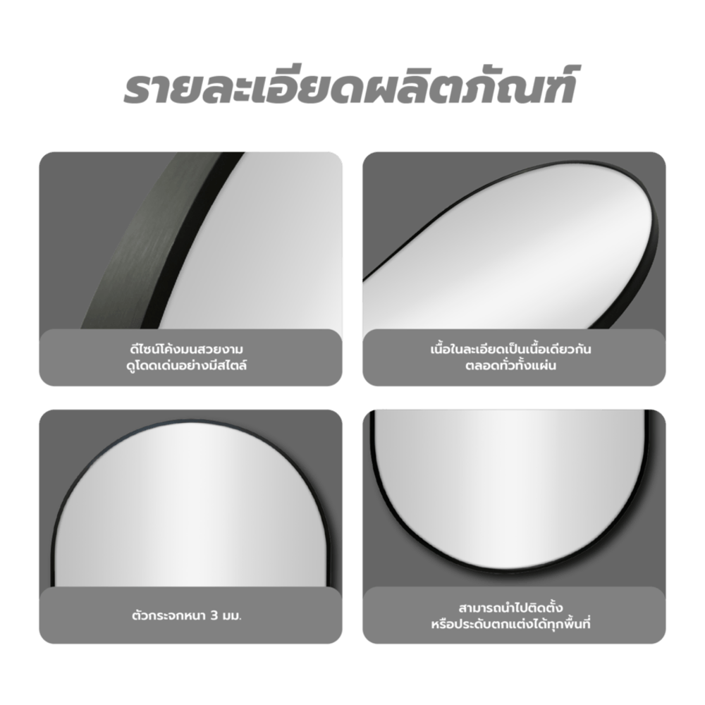 เพิ่มความโดดเด่นให้กับบ้านด้วยกระจกเงามีกรอบอะลูมิเนียมตกแต่ง Nice ชนิดแขวนผนัง ตัวกระจกมีความหนา 3 มิลลิเมตร ให้ภาพเงาสะท้อนที่คมชัด เหมือนจริง ไม่หลอกตา มาพร้อมดีไซน์รูปทรงแบบกลม ให้ความแปลกใหม่และสวยงาม เข้าได้กับหลากหลายสไตล์การแต่งห้อง สามารถนำไปติดตั้งหรือประดับตกแต่งผนังบ้านได้ทุกพื้นที่ เพื่อให้คุณใช้ส่องบุคลิกภาพ ทั้งเสื้อผ้า หน้า ผม ช่วยสร้างความมั่นใจก่อนออกจากบ้านในทุก ๆ วัน