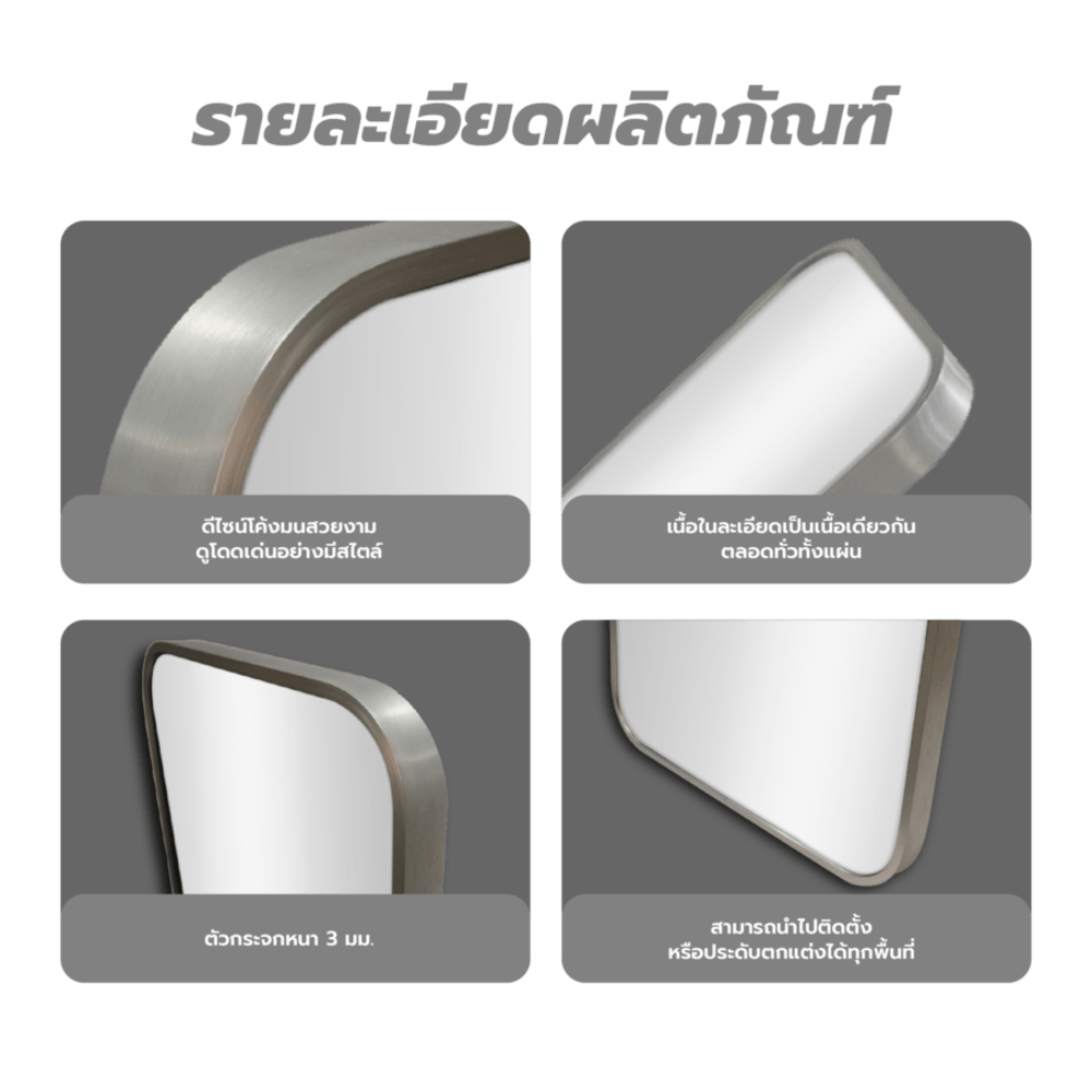 เพิ่มความโดดเด่นให้กับบ้านด้วยกระจกเงามีกรอบอะลูมิเนียมตกแต่ง Nice ชนิดแขวนผนัง ตัวกระจกมีความหนา 3 มิลลิเมตร ให้ภาพเงาสะท้อนที่คมชัด เหมือนจริง ไม่หลอกตา มาพร้อมดีไซน์รูปทรงแบบเหลี่ยมมน ให้ความแปลกใหม่และสวยงาม เข้าได้กับหลากหลายสไตล์การแต่งห้อง สามารถนำไปติดตั้งหรือประดับตกแต่งผนังบ้านได้ทุกพื้นที่ เพื่อให้คุณใช้ส่องบุคลิกภาพ ทั้งเสื้อผ้า หน้า ผม ช่วยสร้างความมั่นใจก่อนออกจากบ้านในทุก ๆ วัน