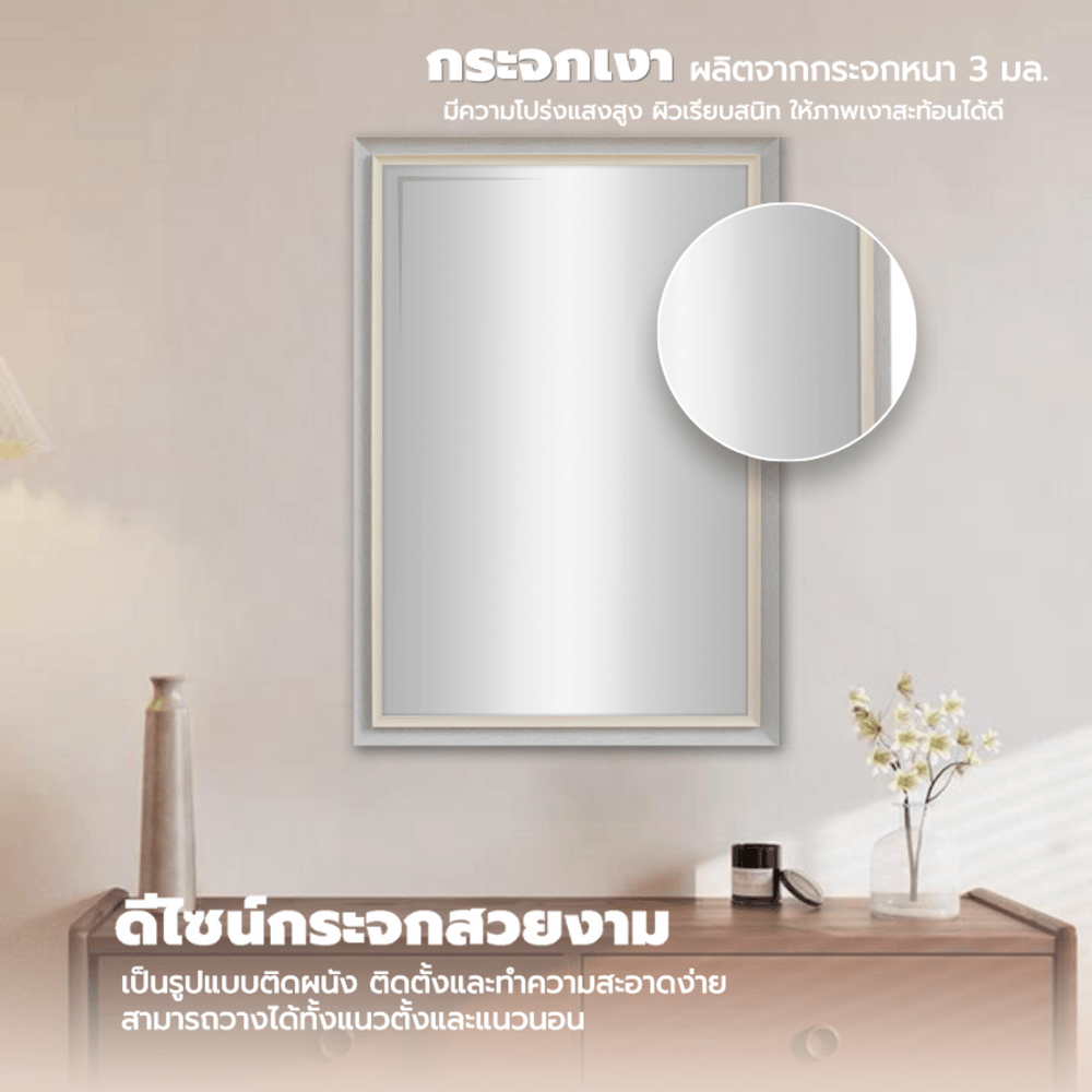 เสริมความมั่นใจในทุกวัน ด้วยกระจกเงา จากแบรนด์ Nice ด้วยกระบวนการผลิตที่ดีเยี่ยม ให้ภาพเงาสะท้อนได้ดี ส่องสะท้อนภาพได้อย่างคมชัด และด้านหลังเคลือบเต็มพื้นที่ ไม่มีตำหนิ หรือรอยขีดข่วน นอกจากนี้ด้วยดีไซน์ของกระจกที่สวยงาม โดดเด่น สามารถนำไปใช้เป็นของประดับตกแต่งผนังบ้านได้ทุกพื้นที่ เพื่อให้คุณมองเห็นตัวเอง ส่องบุคลิกภาพ ไม่ว่าจะเป็นเสื้อผ้า หน้า ผม และการแต่งกาย ว่าเข้ากันได้มั้ย สร้างความมั่นใจก่อนออกจากบ้าน และสร้างความสวยงามให้บ้านของคุณ