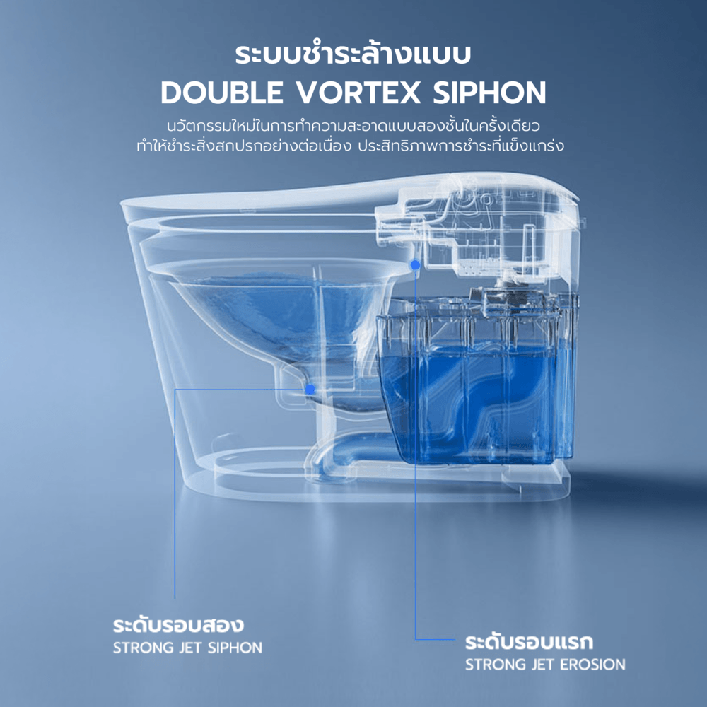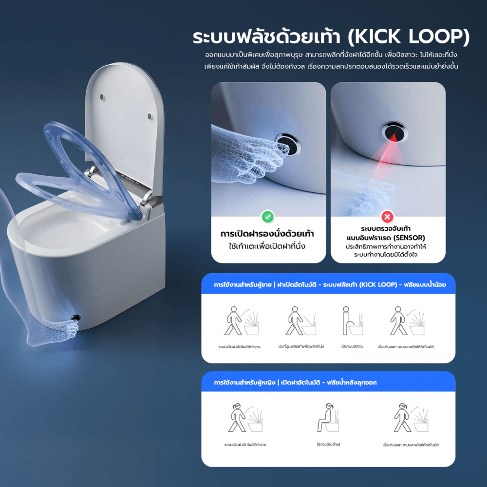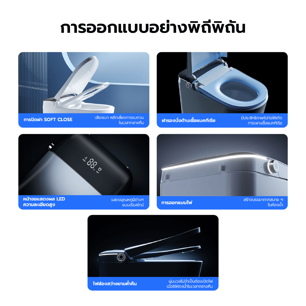 1. ฟังก์ชันการทำงานของฝารองนั่ง ฝารองนั่งเปิด-ปิดอัตโนมัติด้วยเซ็นเซอร์ ปรับความอุ่นของฝารองนั่งได้ตามต้องการ ระบบลมเป่าแห้งหลังการใช้งาน เซ็นเซอร์เท้าสำหรับเปิดฝา สำหรับสุภาพบุรุษ 2. ระบบชำระล้างและการควบคุม ระบบฟลัชอัตโนมัติ เมื่อเดินออก ปุ่มควบคุมด้านข้างตัวโถ เพื่อฟลัช ชำระล้างกรณีไฟดับ ใช้แทนรีโมทได้ ปรับอุณหภูมิของน้ำ ปรับตำแหน่งการฉีดน้ำด้วยระบบปรับระยะก้านฉีด รีโมทคอนโทรลไร้สาย 3. ระบบไฟและการแสดงผล จอ LED Digital แสดงผลบอกอุณหภูมิและเวลา ระบบ LED Night Light เปิดไฟอัตโนมัติในเวลากลางคืน Breathing atmosphere lighting 4. การทำความสะอาดและสุขอนามัย ระบบเคลือบสาร Nano Anti Bacteria ป้องกันแบคทีเรีย ระบบฆ่าเชื้อด้วยรังสี UV (UV sterilization) ระบบดับกลิ่นด้วยกลิ่นหอม (Fragrance deodorizing) ระบบทำความสะอาดตัวเองอัตโนมัติ ด้วย(Bubble Shield Spry รอบภายในโถ) ทำความสะอาดที่ฉีดด้วยตัวเอง (Nozzle self-cleaning) มีฟีลเตอร์กรองน้ำ ระบบป้องกันไฟดูดและไฟรั่วตามมาตรฐาน IPX4