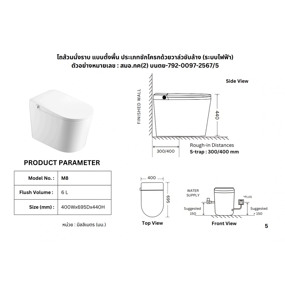 ขนาดสุขภัณฑ์: 695 x 400 x 440 มม. ระบบเดินท่อลงพื้น S-Trap ขนาด 300 มม. ระบบฟลัชแบบ Super Rotating Siphon Jet วัสดุฝารองนั่ง :ABS ระดับน้ำที่ใช้ต่อการฟลัช: 5 ลิตร ใช้ไฟฟ้าบ้าน 220V/50Hz กำลังไฟ: 1300W ช่วงแรงดันน้ำ: 0.15-0.7 Mpa (ไม่มีข้อจำกัดแรงดันน้ำ) น้ำหนัก: 40Kg