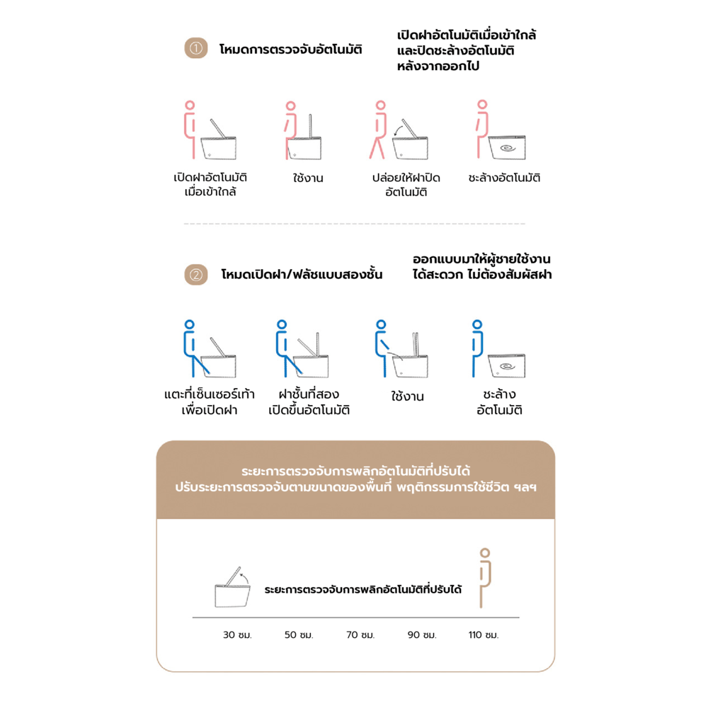 1.ฟังก์ชันการทำงานของฝารองนั่ง ฝารองนั่งเปิด-ปิดอัตโนมัติด้วยเซ็นเซอร์ ปรับความอุ่นของฝารองนั่งได้ตามต้องการ ระบบลมเป่าแห้งหลังการใช้งาน เซ็นเซอร์เท้าสำหรับเปิดฝา สำหรับสุภาพบุรุษ 2. ระบบชำระล้างและการควบคุม ระบบฟลัชอัตโนมัติ เมื่อเดินออก ปุ่มควบคุมด้านข้างตัวโถ เพื่อฟลัช ชำระล้างกรณีไฟดับ ใช้แทนรีโมทได้ ปรับอุณหภูมิของน้ำ ปรับตำแหน่งการฉีดน้ำด้วยระบบปรับระยะก้านฉีด รีโมทคอนโทรลไร้สาย 3. ระบบไฟและการแสดงผล จอ LED Digital แสดงผลบอกอุณหภูมิและเวลา ระบบ LED Night Light เปิดไฟอัตโนมัติในเวลากลางคืน Breathing atmosphere lighting 4. การทำความสะอาดและสุขอนามัย ระบบเคลือบสาร Nano Anti Bacteria ป้องกันแบคทีเรีย ระบบฆ่าเชื้อด้วยรังสี UV (UV sterilization) ระบบดับกลิ่นด้วยกลิ่นหอม (Fragrance deodorizing) ทำความสะอาดที่ฉีดด้วยตัวเอง (Nozzle self-cleaning) มีฟีลเตอร์กรองน้ำ ระบบป้องกันไฟดูดและไฟรั่วตามมาตรฐาน IPX4