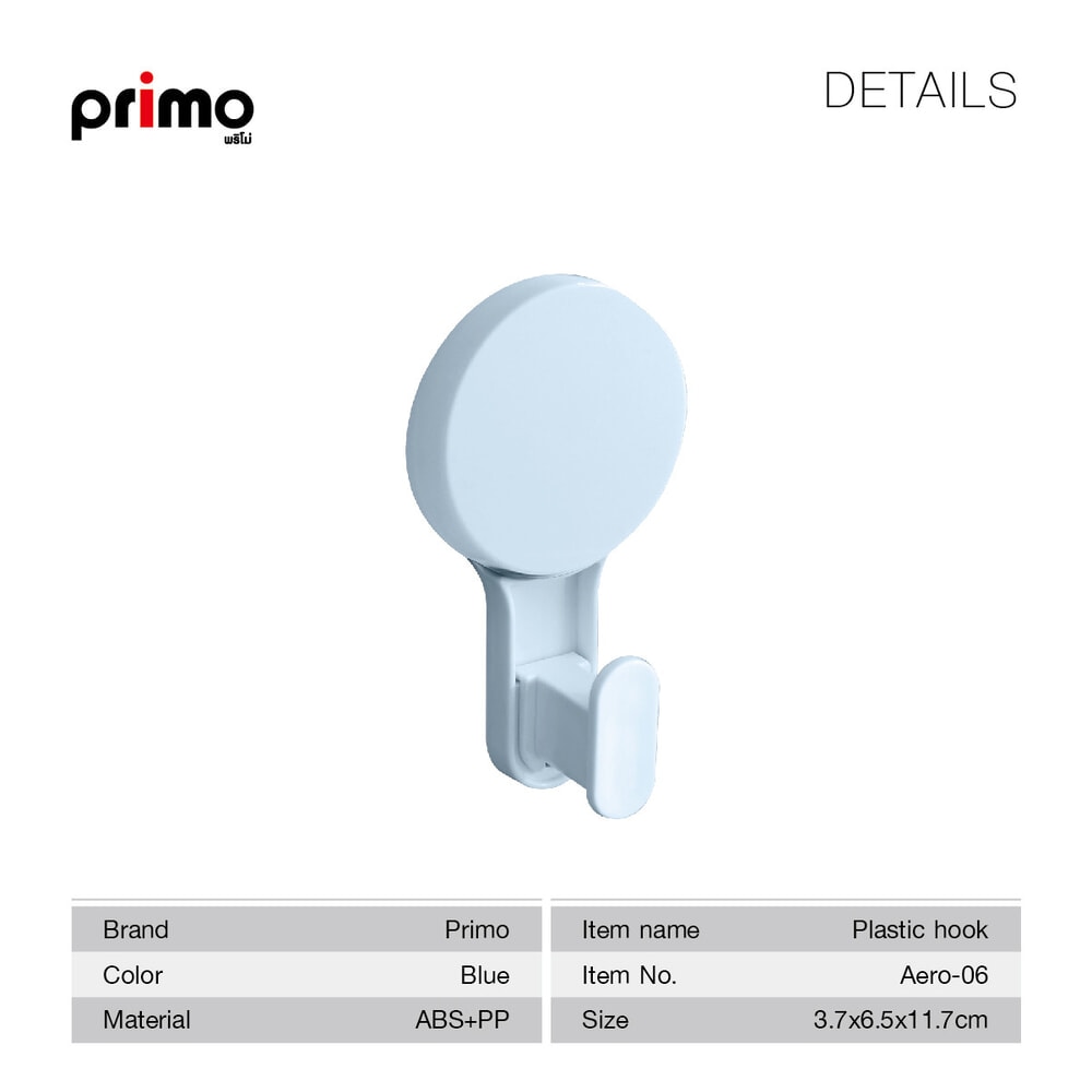 Primo ขอแขวนผ้าพลาสติกแบบเทปกาว รุ่น Aero-06 ขนาด 3.7x6.5x11.7 ซม. สีฟ้า