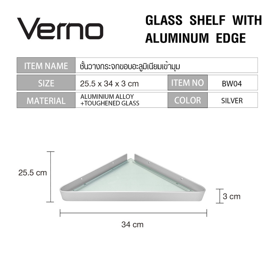 Verno ชั้นวางกระจกขอบอะลูมิเนียมเข้ามุม รุ่น เวนิส BW04 สีเงิน ขนาด 25.5x34x3 ซม.