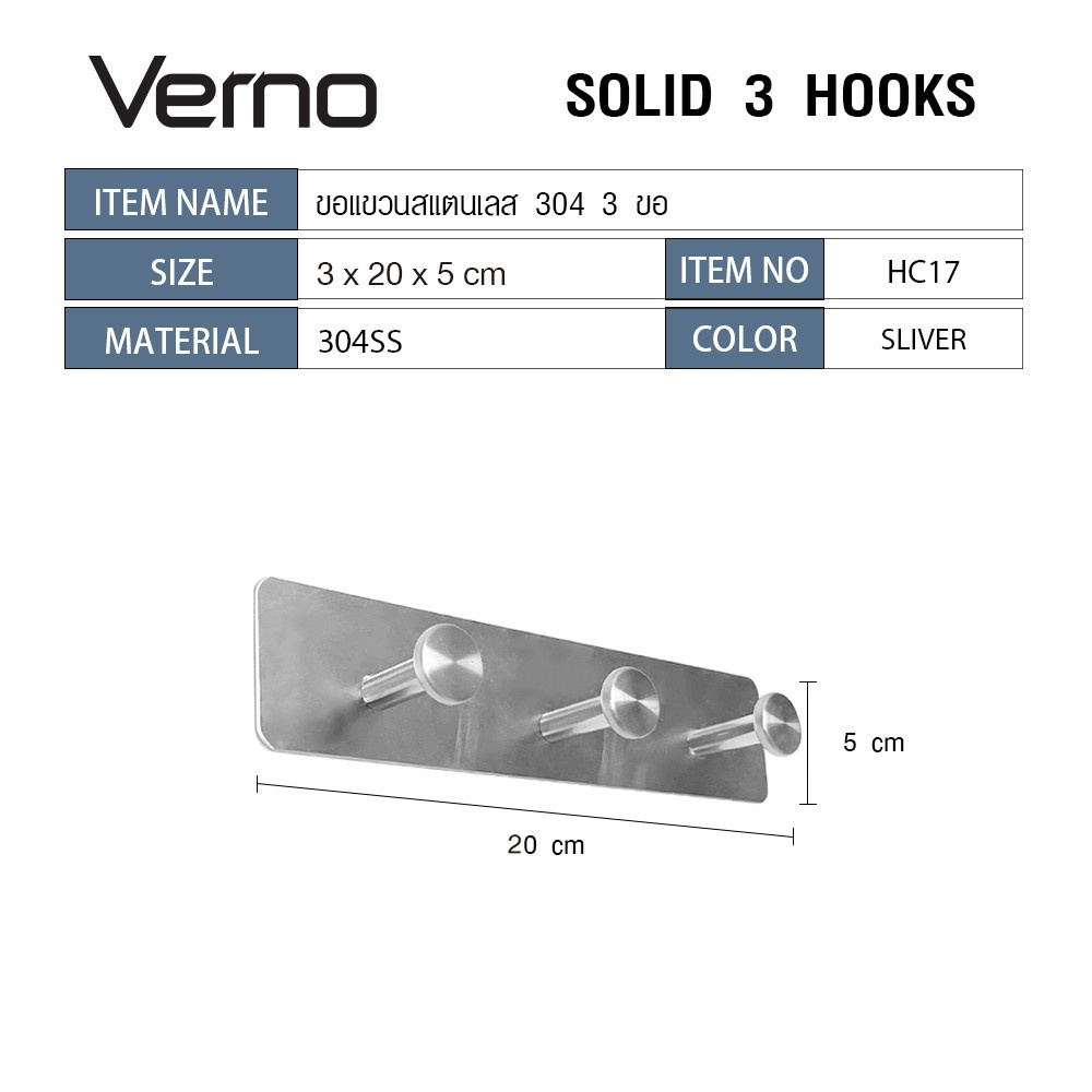 Verno ขอแขวนสแตนเลส 304 3 ขอ รุ่น HC17 ขนาด 3×20×5 ซม. สีเงิน