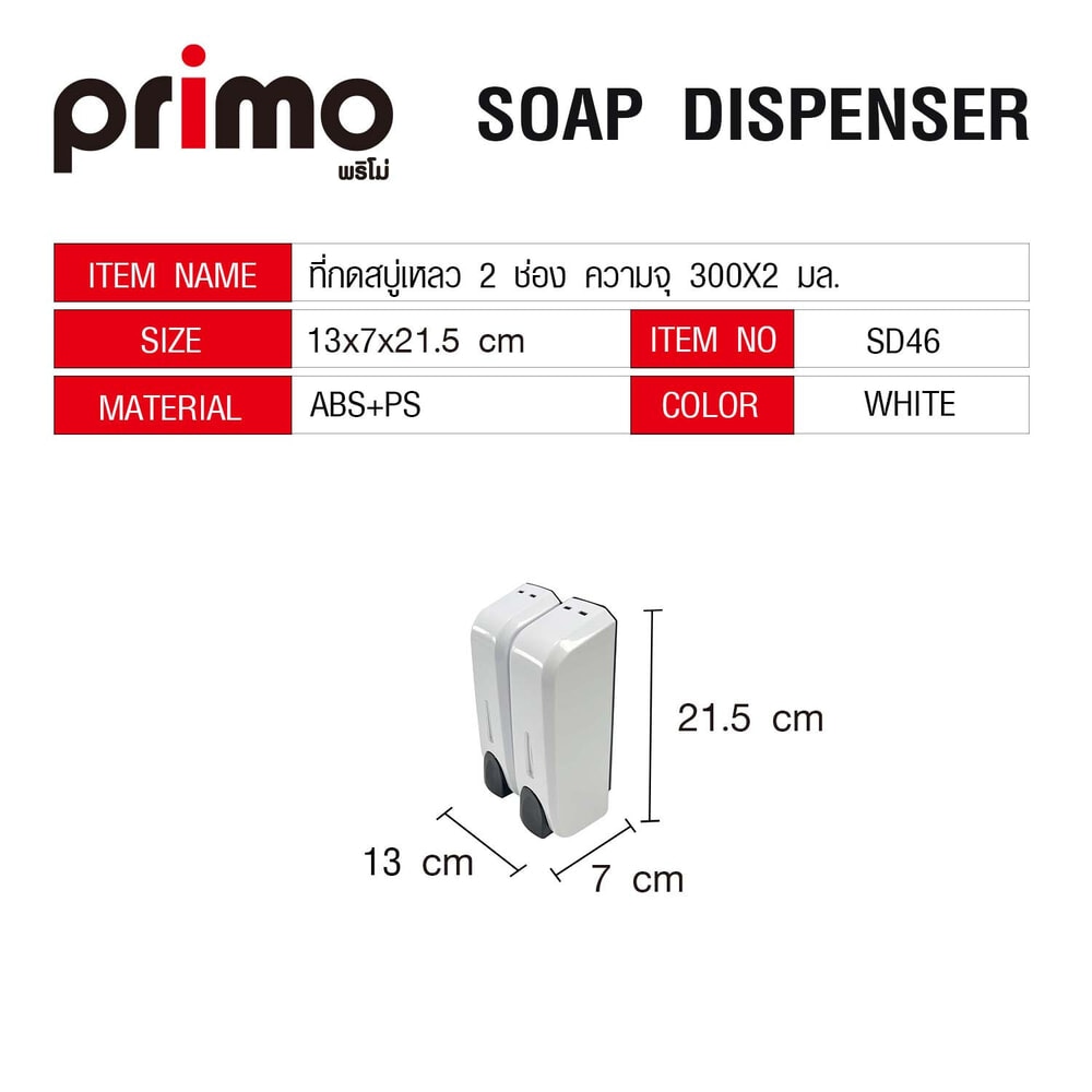 Primo ที่กดสบู่เหลว 2 ช่อง ความจุ 300x2 มล. รุ่น SD46 ขนาด 7x13x21.5ซม. สีขาว