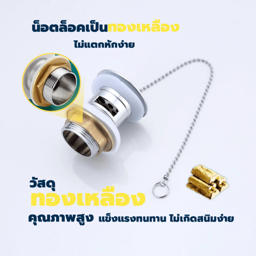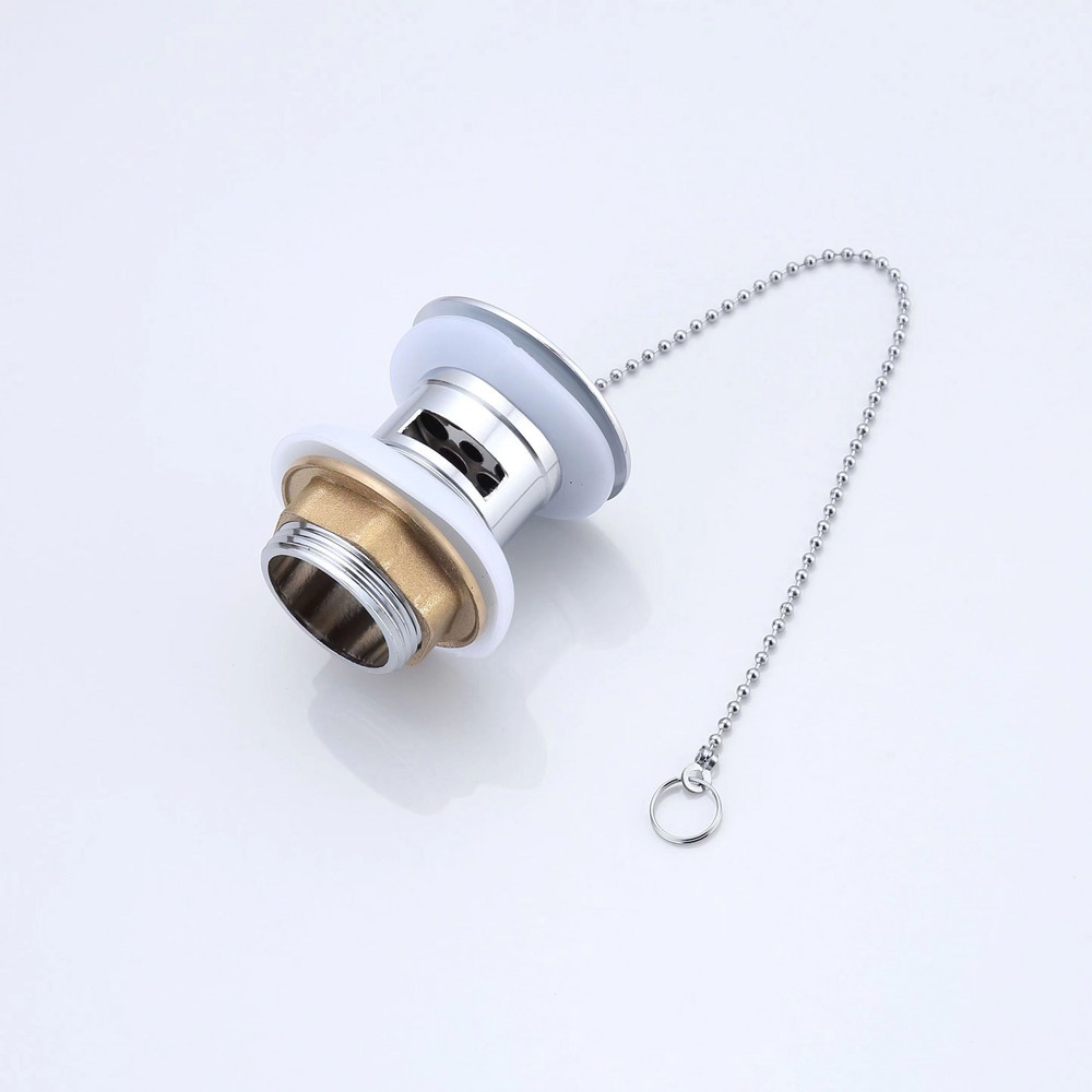 สะดืออ่างล่างหน้าแบบสายโซ่ จากแบรนด์ Verno ใช้ติดตั้งร่วมกับอ่างล้างหน้าแบบไม่มีรูน้ำล้น วัสดุผลิตจากทองเหลืองคุณภาพดี ที่มีความแข็งแรง ทนทาน ทนต่ออากาศและความชื้นสูง ใช้งานได้อย่างยาวนาน ใช้งานง่ายด้วยรูปแบบปุ่มกด เพียงกดขึ้น-ลงก็สามารถควบคุมการไหลของน้ำได้ อีกทั้งดีไซน์ยังสวยงาม ช่วยส่งเสริมความสวยงามให้กับอ่างล้างหน้าของคุณได้เป็นอย่างดี สามารถถอดล้างทำความสะอาดได้ง่าย หมดกังวลเรื่องคราบสกปรกฝังแน่น