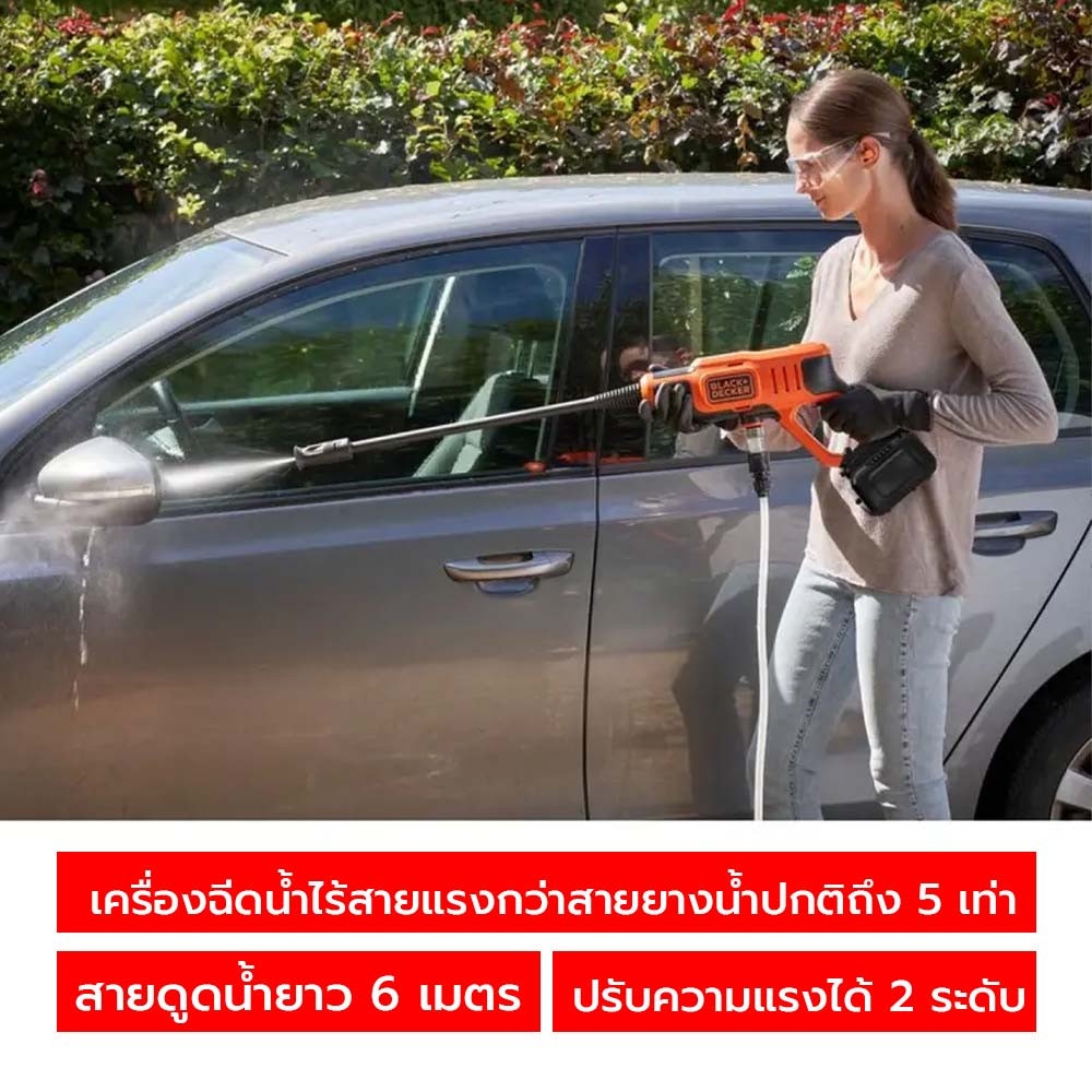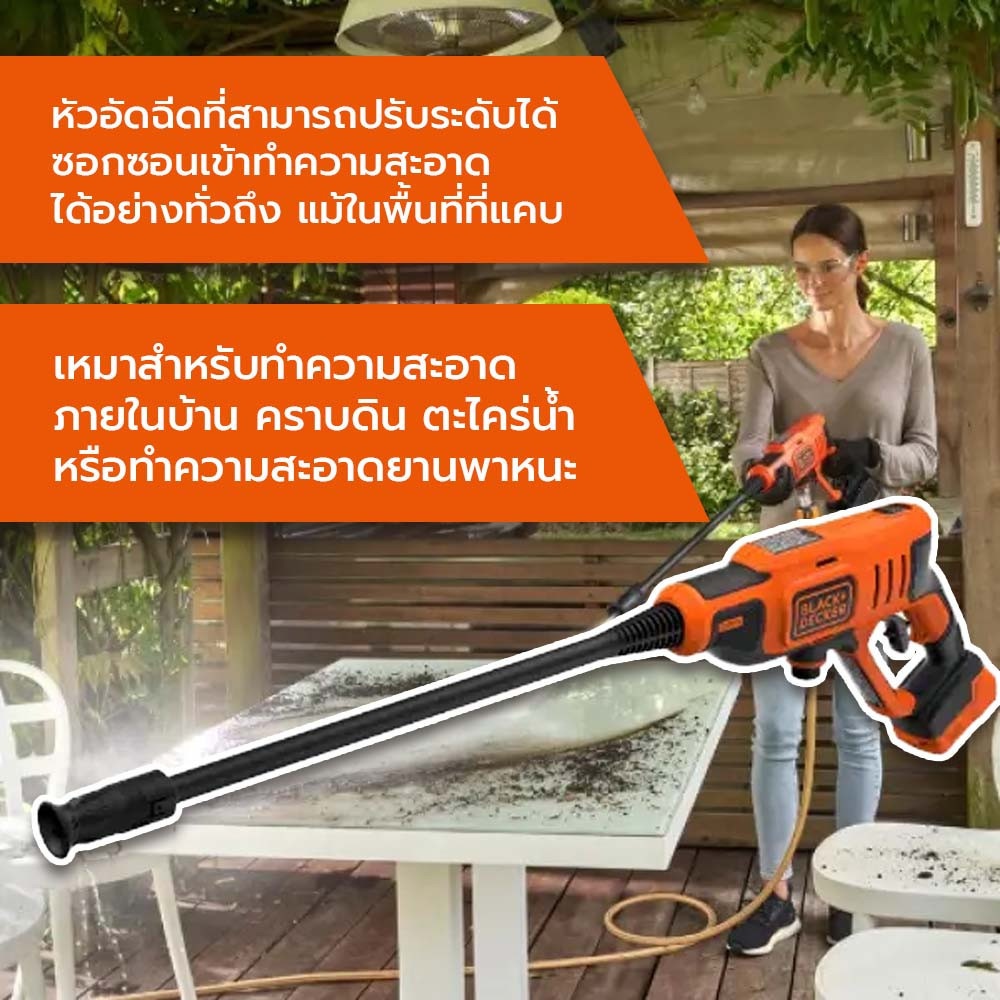 BLACK+DECKER เครื่องฉีดน้ำไร้สาย รุ่น BCPC20D1-B1 ขจัดคราบสกปรกฝังแน่นในบริเวณที่อยู่อาศัย ให้สะอาด และน่าอยู่มากยิ่งขึ้น ด้วยเครื่องฉีดน้ำทรงพลัง ที่มาพร้อมหัวอัดฉีดที่สามารถปรับระดับได้ และซอกซอนเข้าทำความสะอาดได้อย่างทั่วถึง แม้ในพื้นที่ที่แคบ เหมาะสำหรับใช้ฉีดล้างทำความสะอาดบริเวณรอบบ้าน เช่น คราบตะไคร่น้ำบนผนัง, คราบดินโคลนติดฝังแน่นในอุปกรณ์ทำสวน หรือยานพาหนะ เช่น จักรยาน, รถยนต์ หรือมอเตอร์ไซค์ เป็นต้น