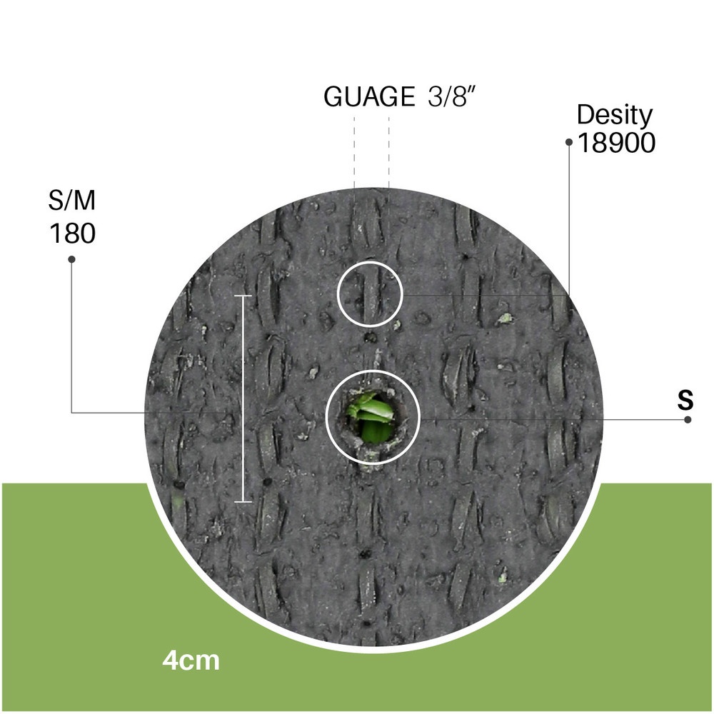| ความสูงของเส้นใย (มม.) ±1มม.: 40 ระยะห่างเข็ม (นิ้ว): 3/8 อัตราการเย็บ (ต่อ 10 ซม.) ±3%: 18 ความหนาแน่นของการเย็บ (ต่อตารางเมตร) ±3%: 18,900 ค่าเดเท็กซ์ (±10%): 9,800 วัสดุเส้นใย: PE+PP สี: 3-โทน วัสดุรองด้านหลัง: ผ้า PP+ตาข่าย การเคลือบ: สีดำ SBR น้ำหนัก กก./ตร.ม. (±10%): 2.89 |