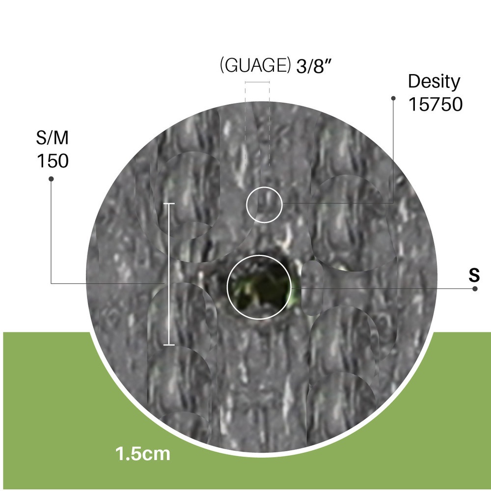 | ความสูงของเส้นใย (มม.) ±1มม.: 15 ระยะห่างเข็ม (นิ้ว): 3/8 อัตราการเย็บ (ต่อ 10 ซม.) ±3%: 15 ความหนาแน่นของการเย็บ (ต่อตารางเมตร) ±3%: 15,750 ค่าเดเท็กซ์ (±10%): 9,200 วัสดุเส้นใย: PE+PP สี: 4-โทน วัสดุรองด้านหลัง: ผ้า PP+ตาข่าย การเคลือบ: สีดำ SBR น้ำหนัก กก./ตร.ม. (±10%): 1.78 |