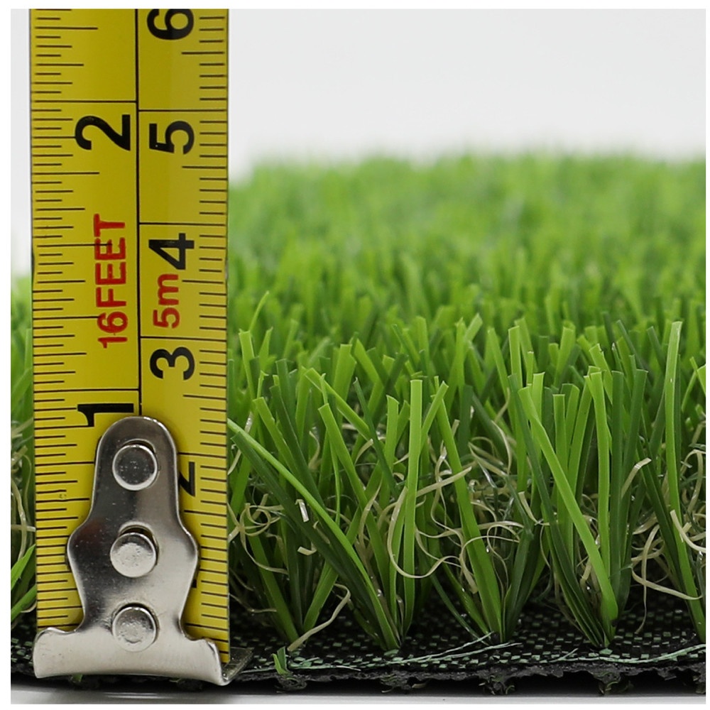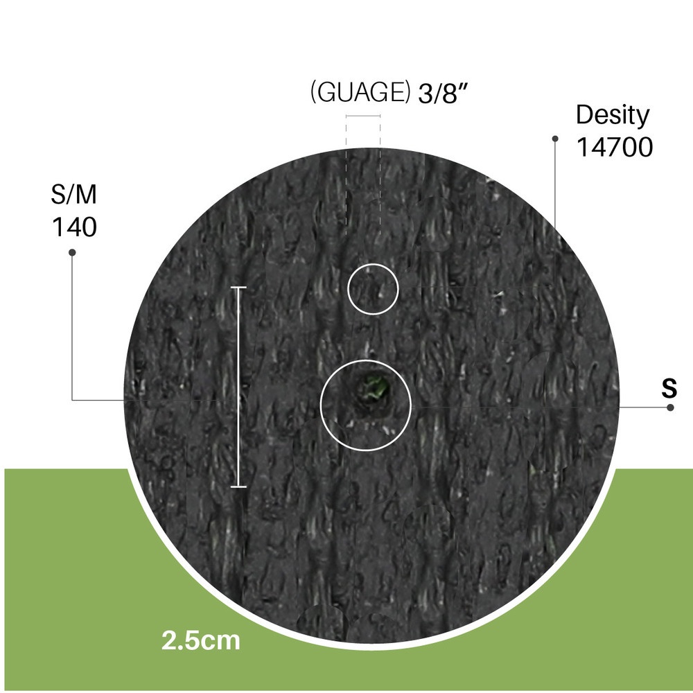 | ความสูงของเส้นใย (มม.) ±1มม.: 25 ระยะห่างเข็ม (นิ้ว): 3/8 อัตราการเย็บ (ต่อ 10 ซม.) ±3%: 14 ความหนาแน่นของการเย็บ (ต่อตารางเมตร) ±3%: 14,700 ค่าเดเท็กซ์ (±10%): 7,300 วัสดุเส้นใย: PE+PP สี: 4-โทน วัสดุรองด้านหลัง: ผ้า PP+ตาข่าย การเคลือบ: สีดำ SBR น้ำหนัก กก./ตร.ม. (±10%): 1.87 |