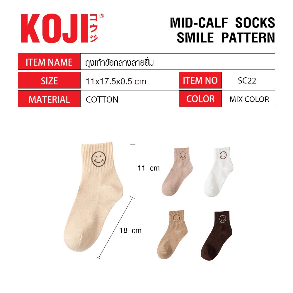 KOJI ถุงเท้าข้อกลางลายยิ้ม รุ่นSC22 ขนาด11x17.5x0.5ซม.คละสี