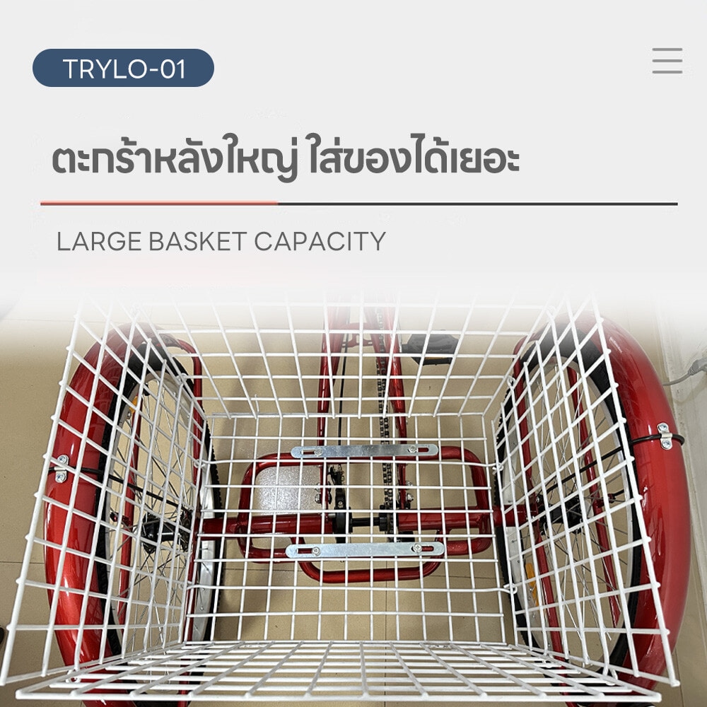 ตะกร้าหลังขนาดใหญ่: มาพร้อมตะกร้าหลังขนาด 55 x 25 x 28 ซม. ใส่ของได้จุใจ ไม่ว่าจะเป็นของใช้ส่วนตัว กระเป๋า หรือของซื้อของขาย