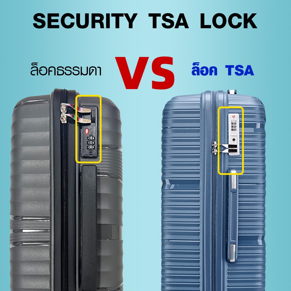 กระเป๋าเดินทางมีระบบล็อค TSA (Transportation Security Administration) ที่ได้รับมาตรฐานระดับสากล เจ้าหน้าที่ตรวจสอบสนามบินสามารถเปิดตรวจได้โดยไม่ต้องทำลายตัวล็อค ช่วยป้องกันการถูกงัดแงะและเพิ่มความปลอดภัยให้กับสัมภาระของคุณ
