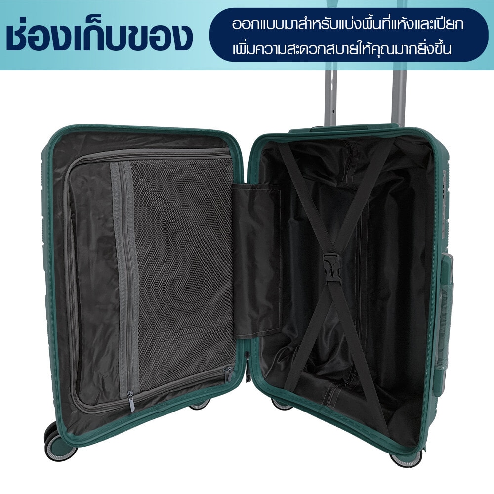 กระเป๋าเดินทางดีไซน์สวย ออกแบบมาให้มีความเป็นเอกลักษณ์เฉพาะตัว โดดเด่นไม่ซ้ำใคร มาพร้อมล้อลากที่สามารถหมุนได้รอบทิศทาง เพื่อให้เคลื่อนย้ายได้อย่างสะดวก ผลิตจากวัสดุ PP โดยภายในตัวกระเป๋ามีช่องให้สามารถเก็บได้อย่างหลากหลาย สะดวกทั้งต่อการจัดเก็บและการค้นหา