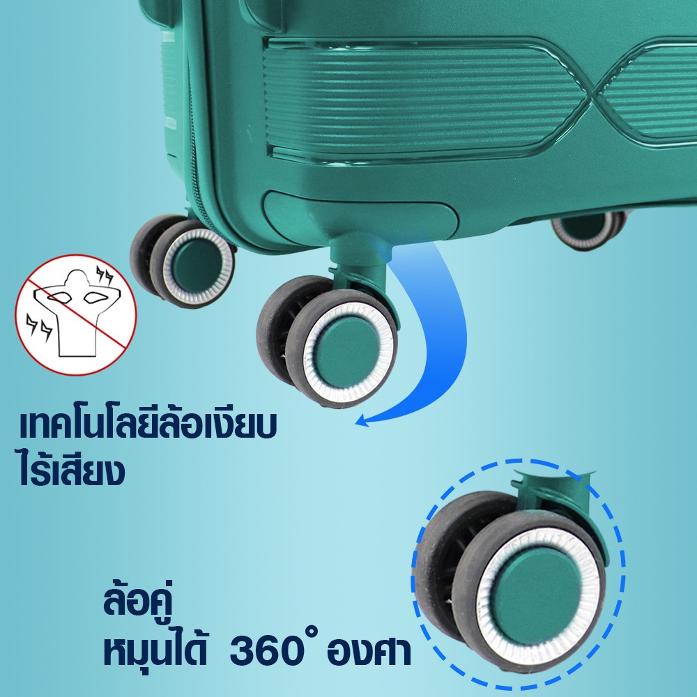 กระเป๋ามาพร้อมล้อคู่ที่สามารถหมุนได้รอบทิศทาง 360 องศา ช่วยให้ลากกระเป๋าได้อย่างราบรื่น ไม่ติดขัด สามารถเคลื่อนที่ได้ง่ายบนทุกพื้นผิว ไม่ว่าจะเป็นสนามบิน โรงแรม หรือถนนที่ขรุขระ