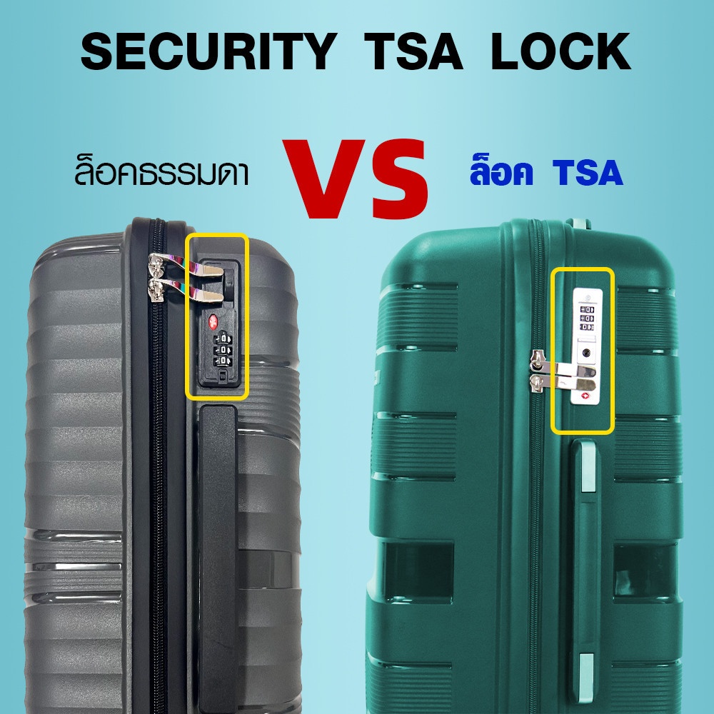 กระเป๋าเดินทางมีระบบล็อค TSA (Transportation Security Administration) ที่ได้รับมาตรฐานระดับสากล เจ้าหน้าที่ตรวจสอบสนามบินสามารถเปิดตรวจได้โดยไม่ต้องทำลายตัวล็อค ช่วยป้องกันการถูกงัดแงะและเพิ่มความปลอดภัยให้กับสัมภาระของคุณ