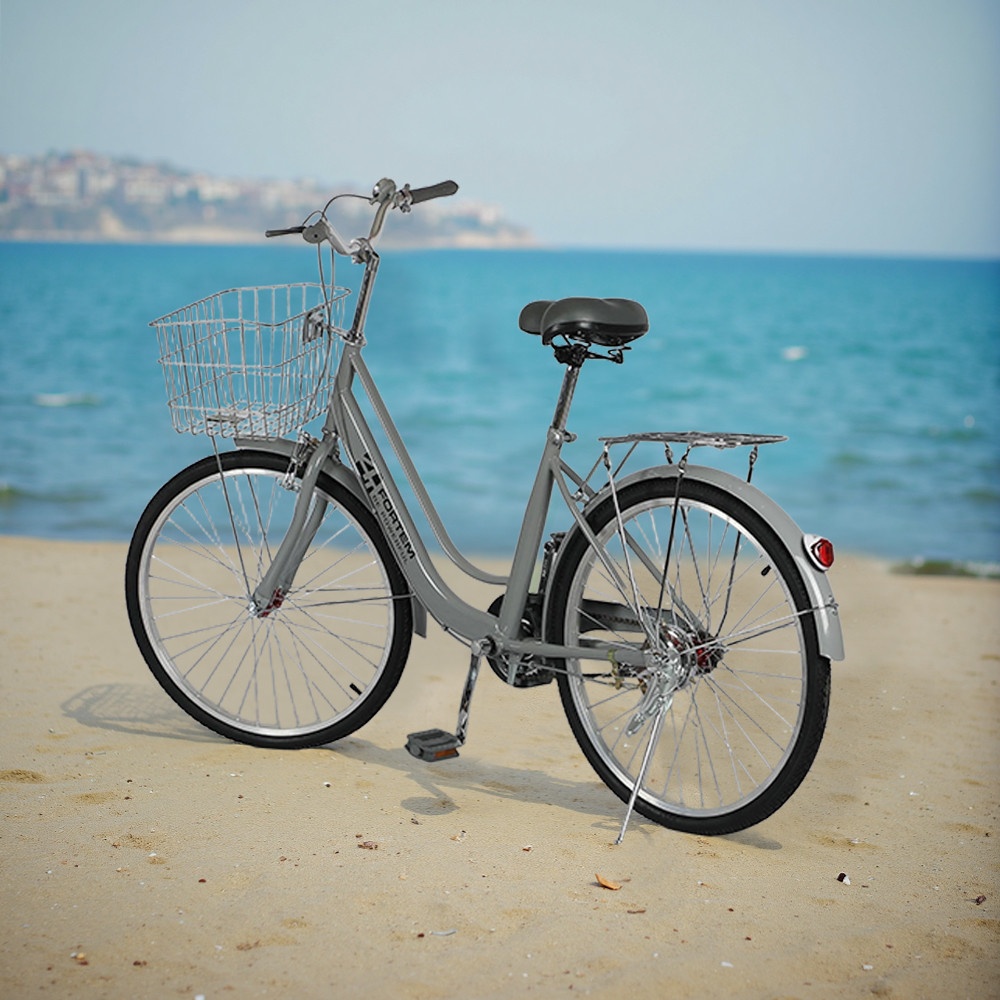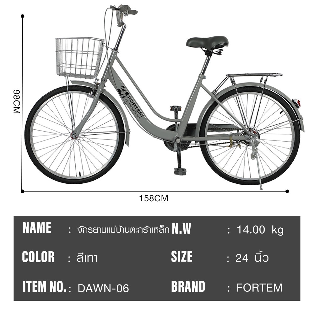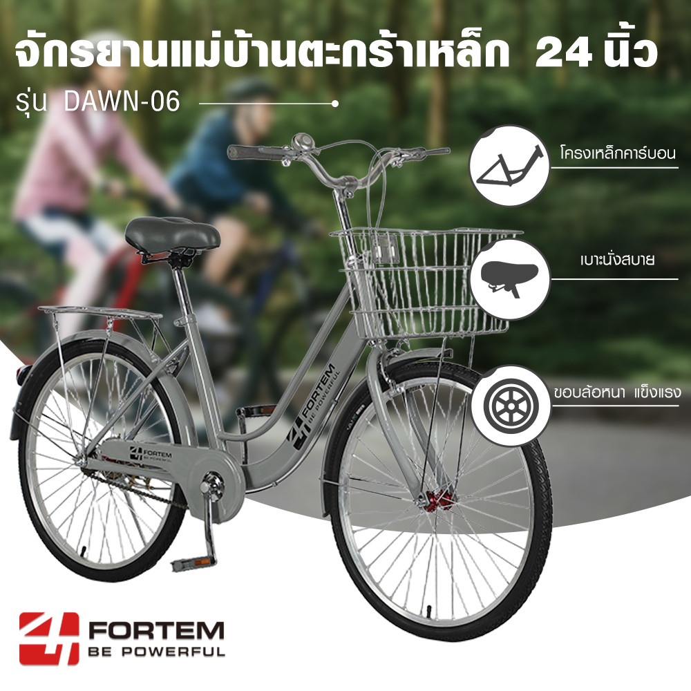 FORTEM รุ่น DAWN-06 ขนาด 24 นิ้ว สีเทา คือจักรยานแม่บ้านที่ออกแบบมาเพื่อการใช้งานในชีวิตประจำวันโดยเฉพาะ ไม่ว่าจะเป็นการปั่นไปตลาด โรงเรียน ทำธุระ หรือขี่เพื่อสุขภาพ รุ่นนี้ผสมผสานความสวยงามเรียบง่ายกับความแข็งแรงได้อย่างลงตัว
