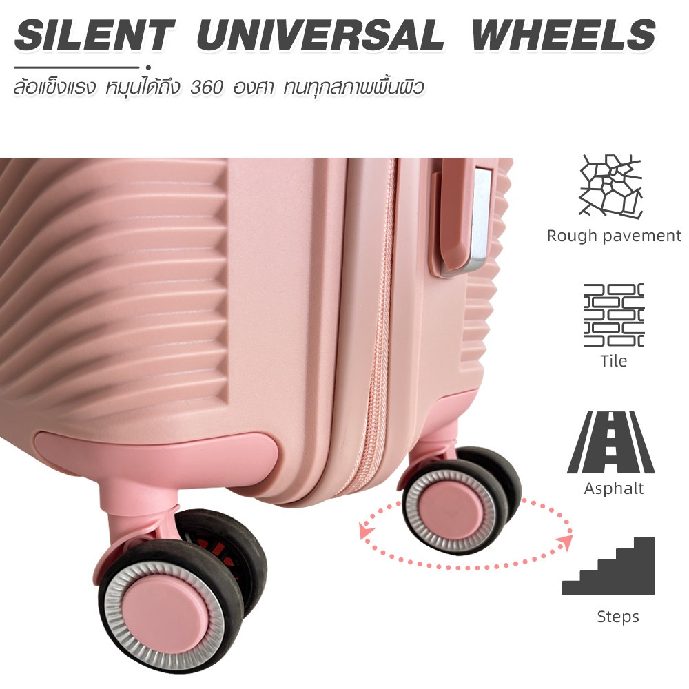 นอกจากนี้ กระเป๋ายังมาพร้อมล้อคู่หมุนได้ 360 องศา ทำให้เคลื่อนที่ได้อย่างคล่องตัวในทุกทิศทาง ไม่ว่าจะลาก ดัน หรือเข็น ก็ทำได้อย่างสะดวกสบาย พร้อมคันชักอะลูมิเนียมที่แข็งแรง ปรับระดับได้ตามความสูงของผู้ใช้งาน และภายในที่กว้างขวาง พร้อมสายรัดสัมภาระและช่องซิปจัดเก็บที่ช่วยให้การจัดของเป็นระเบียบเรียบร้อย