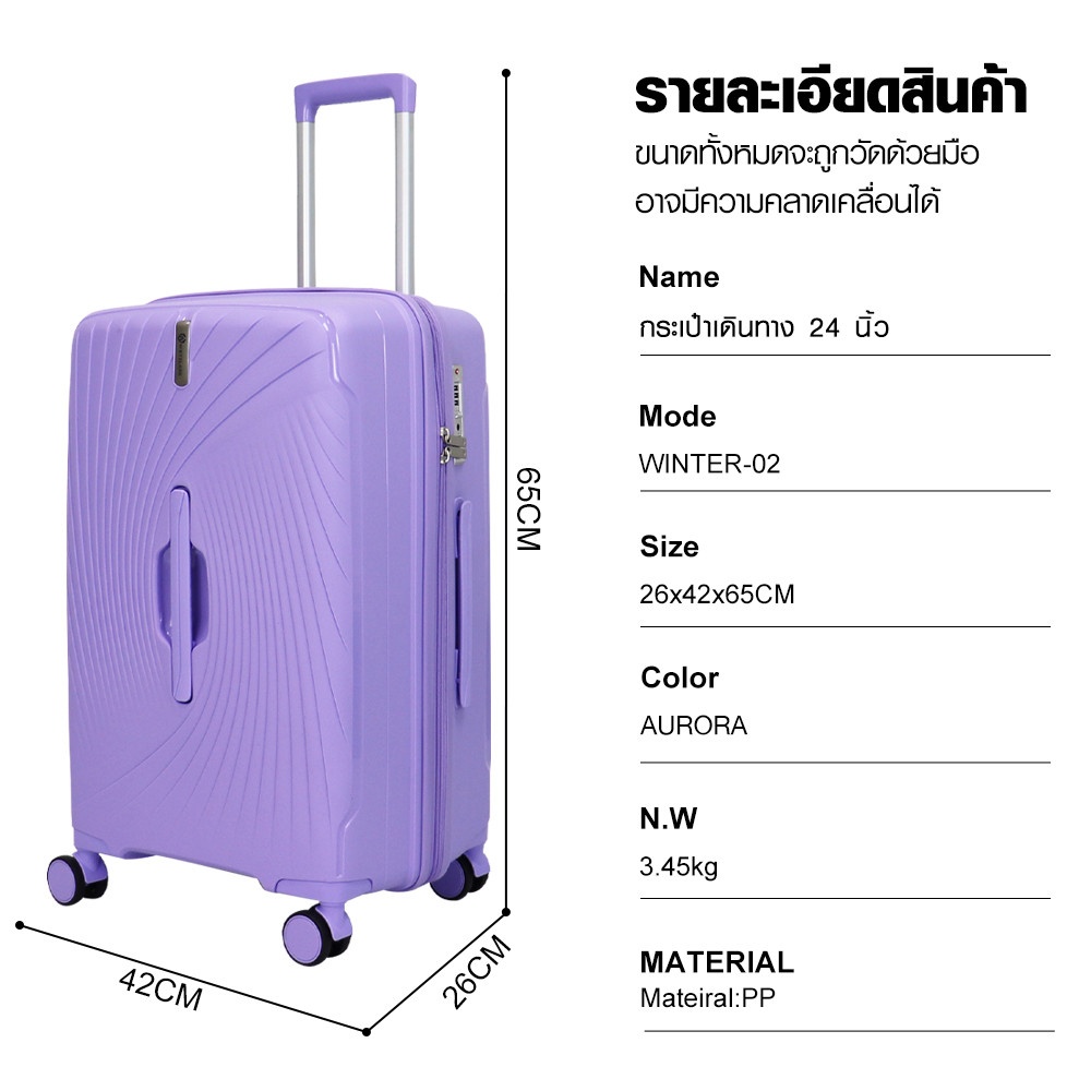 ด้วยขนาด 26 x 42 x 65 ซม. Winter-02 ขนาด 24 นิ้วเหมาะสำหรับการเดินทางสั้น ทริปสุดสัปดาห์หรือทริปยาวก็ได้