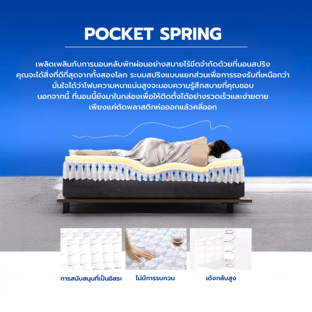 ที่นอนรุ่น Violet ใช้ แผ่นสปริงห่อด้วยปลอกโฟม ซึ่งสามารถปรับให้เข้ากับแรงกดและการเคลื่อนไหวของร่างกาย ช่วยลดการถ่ายโอนแรงสั่นสะเทือนจากคนข้างๆ ทำให้ไม่ถูกรบกวนขณะนอน นอกจากนี้ ยังมี ขอบเสริมพิเศษ ที่ช่วยขยายพื้นที่ใช้งานของที่นอน ทำให้มั่นใจได้ถึงความมั่นคง ไม่ว่าจะนอนส่วนไหนของที่นอนก็ตาม