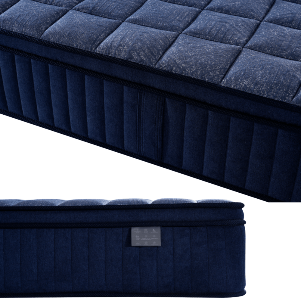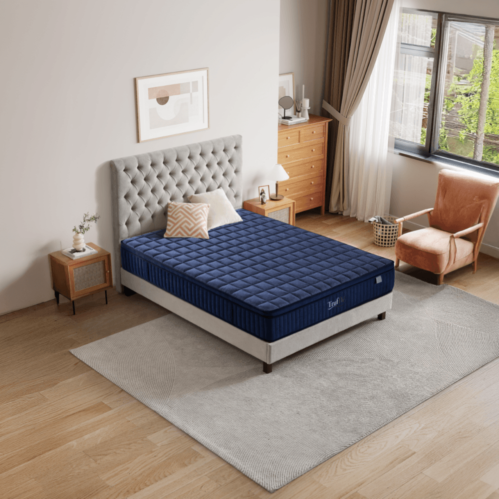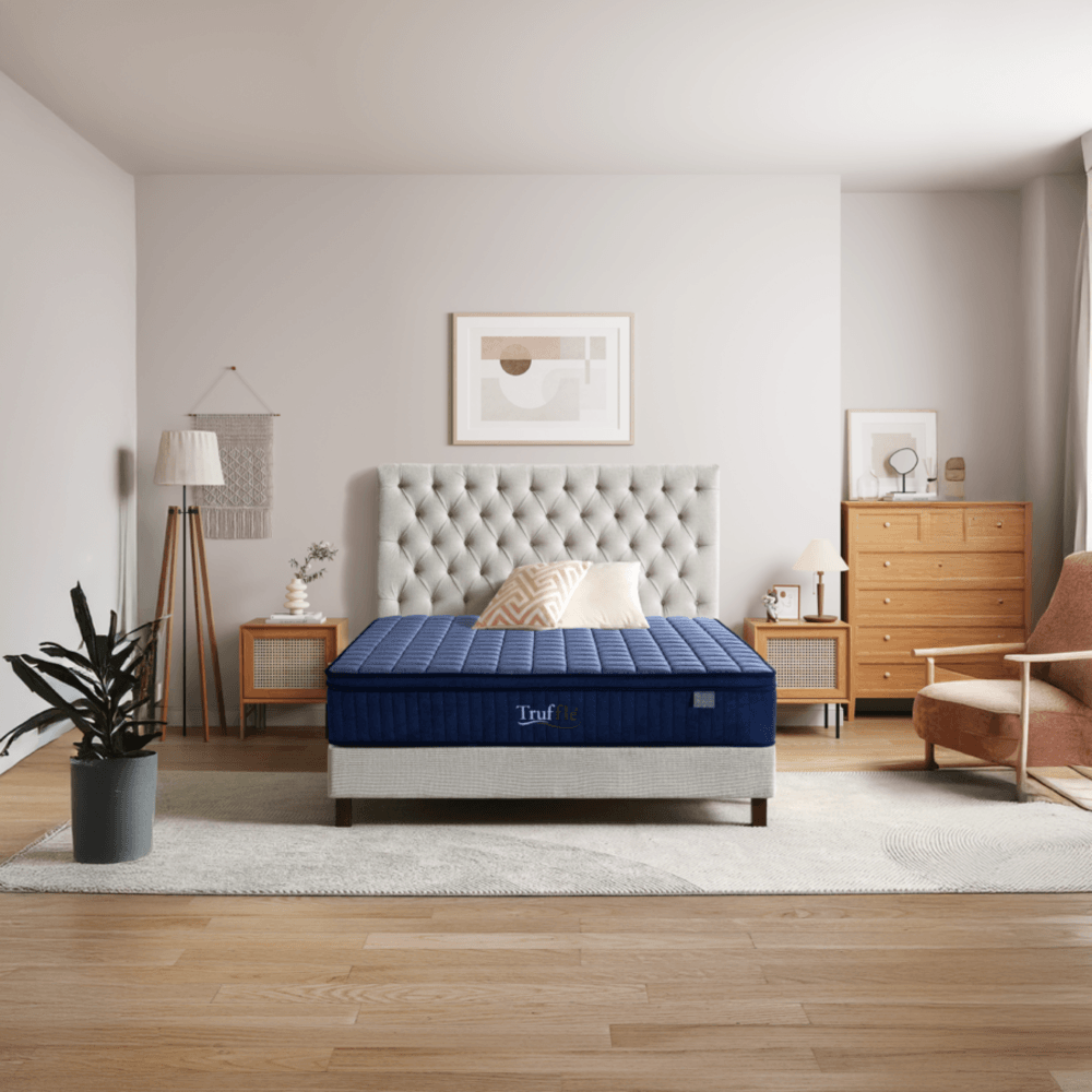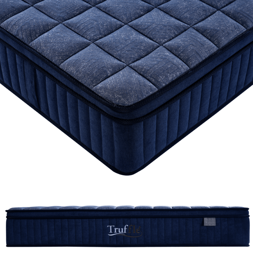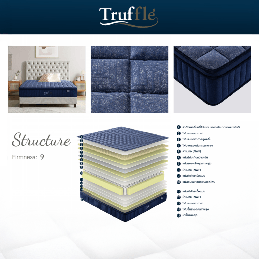 ที่นอน Truffle รุ่น Violet 6 ฟุต ขนาด: 180 x 200 x 28 ซม. สีน้ำเงิน เป็นที่นอนระดับพรีเมียมที่ได้รับการออกแบบให้มีโครงสร้าง 15 ชั้น เพื่อมอบประสบการณ์การนอนที่เหนือระดับ โดยมีความแน่นในระดับ 9 ทำให้สามารถรองรับสรีระของร่างกายได้อย่างยอดเยี่ยม พร้อมทั้งยังช่วยกระจายน้ำหนัก ลดแรงกดทับ และเพิ่มความสบายในการนอน